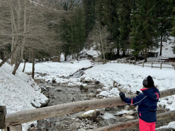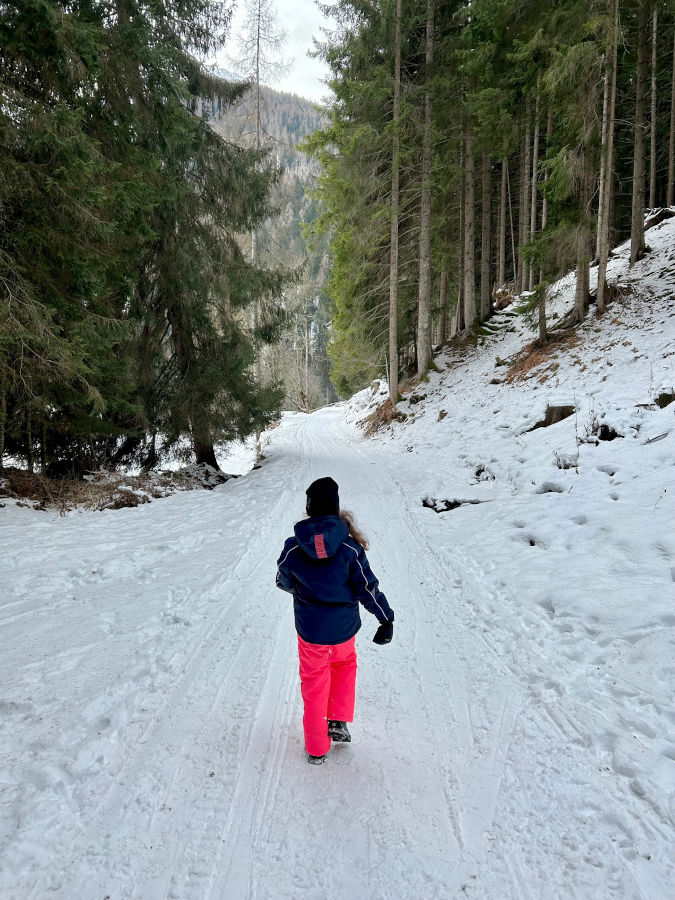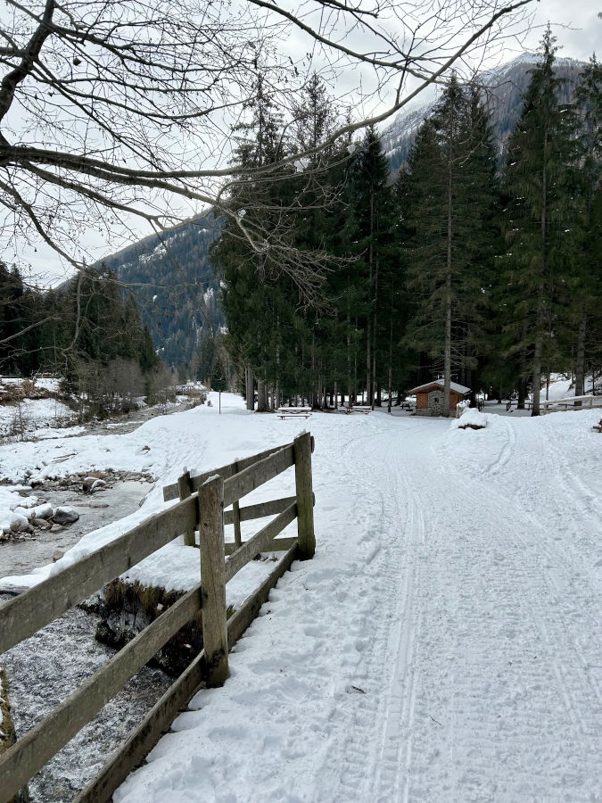 Arrivati in fondo, sotto al ponte tibetano (sopra la vostra testa a destra), prima delle piste da fondo, trovate il cartello che indica dove dovete lasciare la slitta. Potete poi decidere di allungare la passeggiata proseguendo, sempre sulla forestale, verso la segheria veneziana. Il sentiero è molto suggestivo: da un lato il bosco, dall’altra il torrente. E poi si ritorna alla macchina percorrendo la strada che passa davanti al centro per lo sci di fondo.