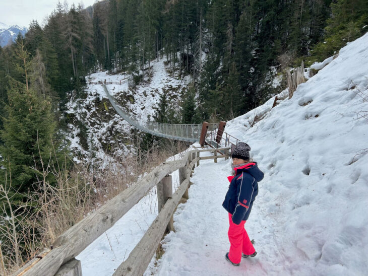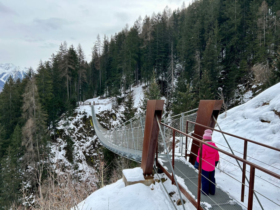 Si parte dal parcheggio che si trova subito dopo le Terme di Rabbi e si prende la strada sulla sinistra (è tutto indicato). La strada sale in modo abbastanza dolce per circa 20 minuti, dopodiché bisogna svoltare a destra, seguendo la strada forestale. Ancora una ventina di minuti di camminata e si raggiunge il ponte sospeso. Lungo 100 metri e alto fino a 60 metri, si percorre facilmente (sempre che non soffriate di vertigini!). Noi siamo stati tra i primi a vederlo, nella lontana estate del 2016: trovate il nostro racconto nell’articolo estivo Ponte sospeso in Val di Rabbi, sempre aggiornato!