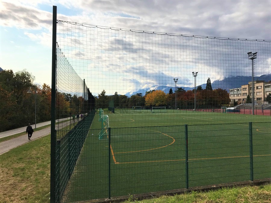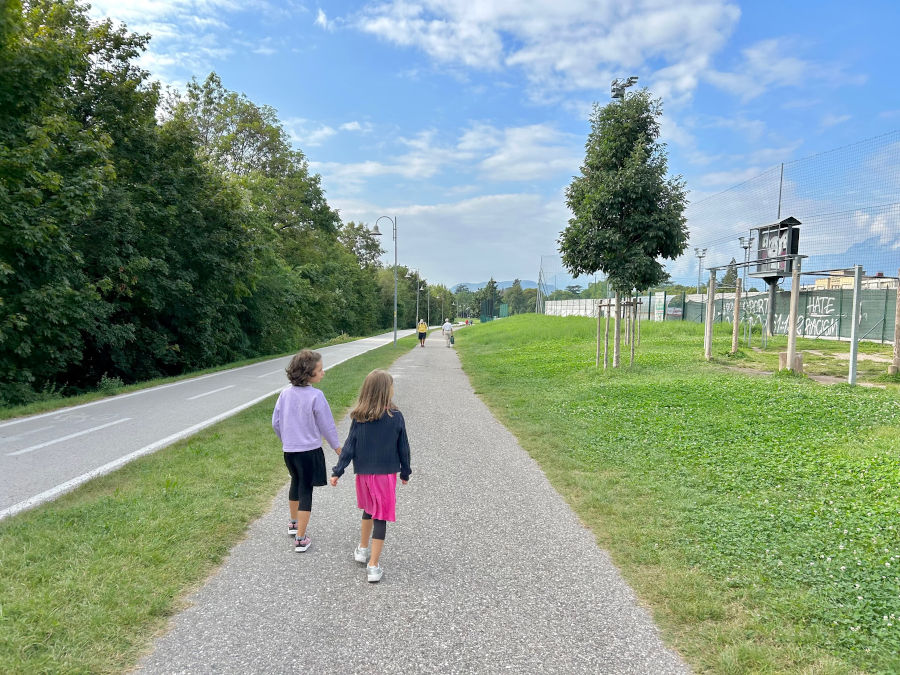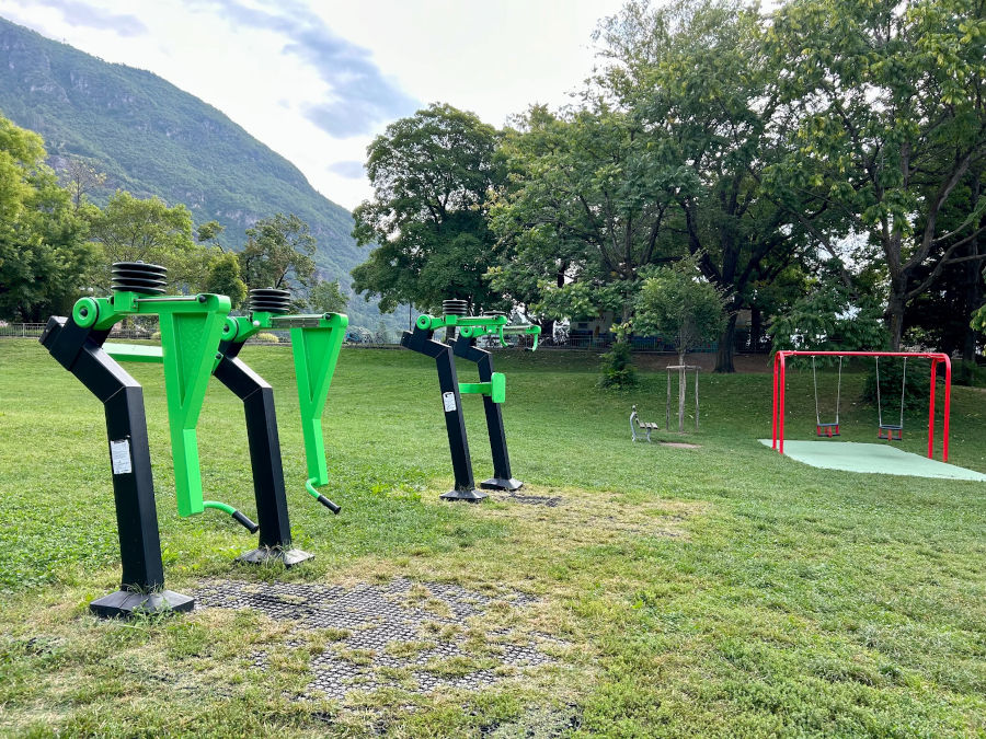 Dopo una dovuta sosta-gioco proseguiamo lungo la ciclopedonale e troviamo campi da calcio, tennis e aree fitness all’aperto per i gli amanti degli sport.