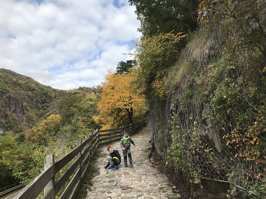 Un lungo viale alberato che regala di tanto in tanto, tra le fronde colorate, degli scorci meravigliosi sulle colline circostanti, su antichi edifici immersi tra i vigneti e in lontananza come sfondo, le cime innevate del Catinaccio/Rosengarten.