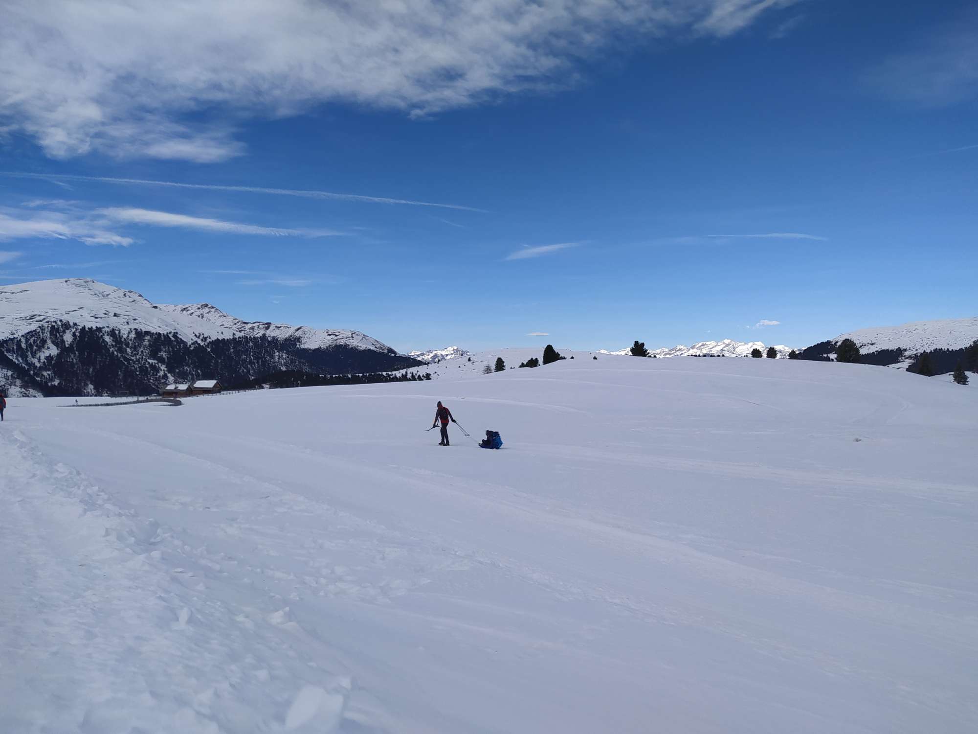 Potete rimanere sul sentiero principale o prendere una delle altre tracce battute (usate per lo sleddog), restando alla sinistra del sentiero. Davanti a voi vedrete la Malga Munt de Fornella (chiusa in inverno): proseguite mantenendo la sinistra fino al limitare del bosco, dove il sentiero si fa più stretto (vedrete una roccia con due “troni” di legno ed una Madonnina: siete nella direzione giusta!).