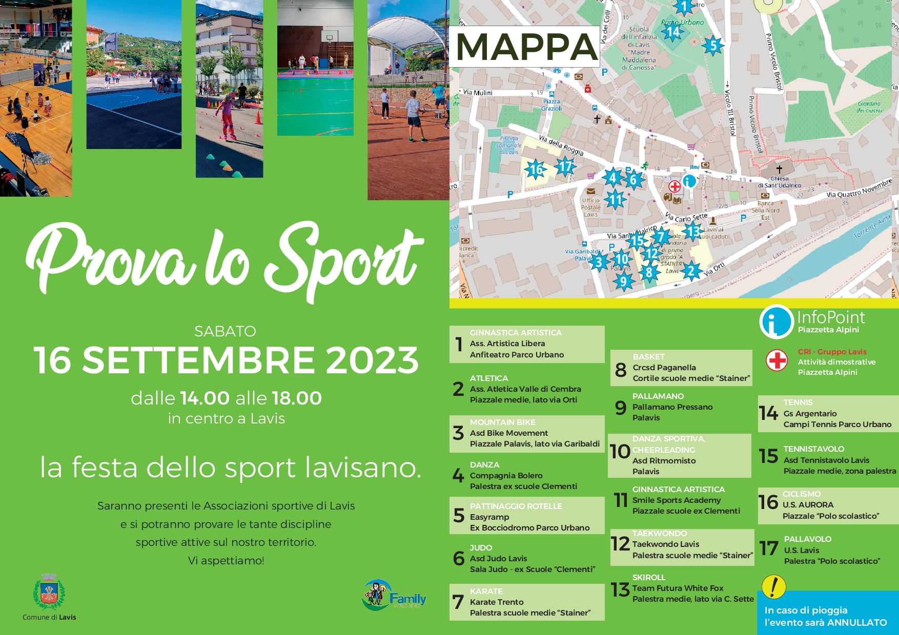 Sabato 16 settembre 2023, solo in caso di bel tempo, torna la sempre attesa manifestazione che permette ai bambini e ai ragazzi di toccare con mano l’offerta sportiva presente sul territorio di Lavis: “Prova lo sport”, promossa dal Comune di Lavis.