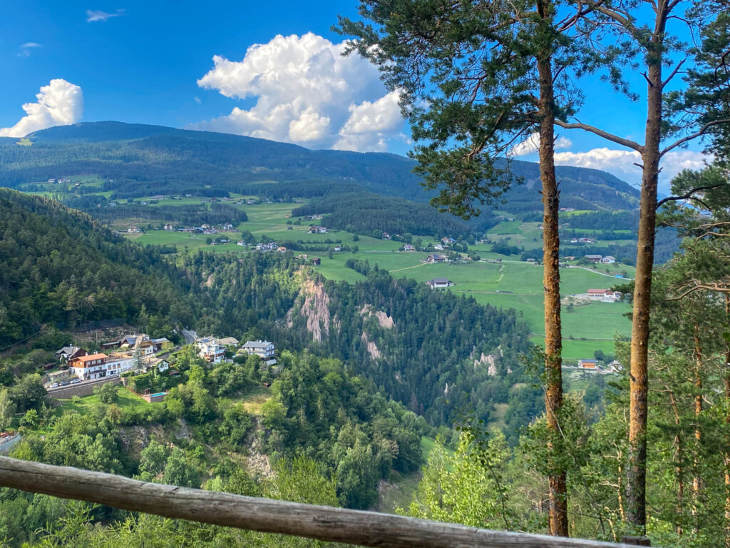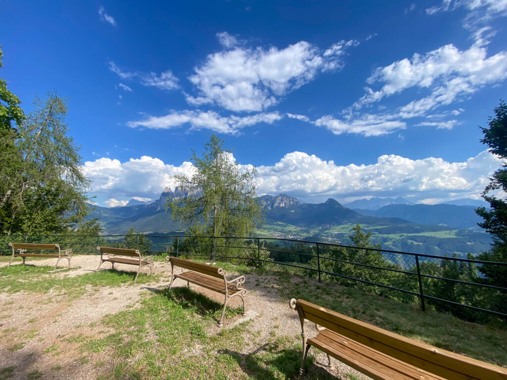Proseguendo sul percorso ecco altri balconi con vista, da cui potrete vedere il dente dello Sciliar, il Sassolungo e il Sassopiatto, le Odle, il Catinaccio e in generale tutti i paesini del versante opposto. Davvero idilliaco.