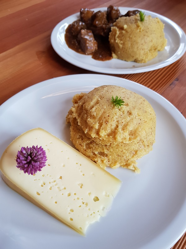 Eh sì, perchè salendo qui respirerete a pieni polmoni sia la tipica vita dell’alpeggio con le mucche al pascolo, l’aria frizzantina e uno splendido panorama sulla Val di Rabbi, sia il piacere di mangiare bene con prodotti genuini e ricette originali in alta quota. La cucina è senza dubbio la passione dei giovani gestori che propongono piatti della tradizione ma spesso leggendoli con un tocco di fantasia, fatto che rende il menù di Malga Mondent piuttosto originale!