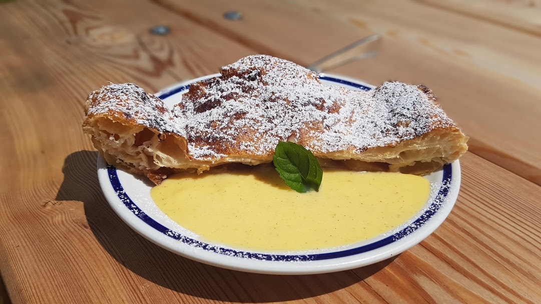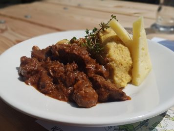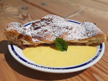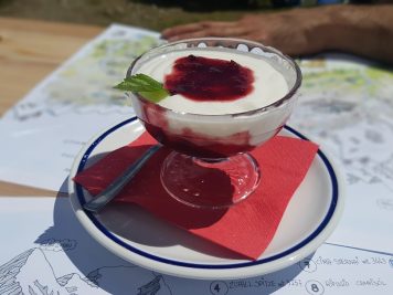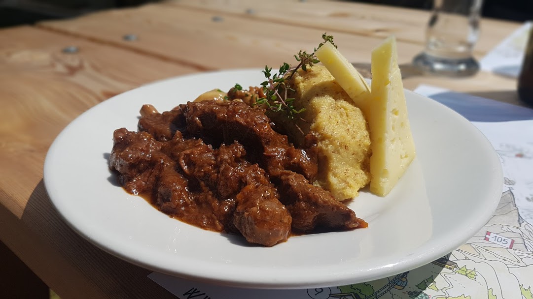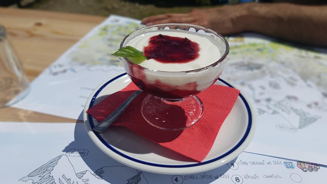 Dopo questa bella ed impegnativa escursione la fame è davvero tanta e la scelta non poteva che ricadere sulla proposta più sostanziosa: il piatto rifugio! Spezzatino, funghi, polenta e formaggio, molto buono e gustoso, non è sempre scontato nei rifugi d’alta quota, quindi un plauso alla cucina per gli ottimi prodotti! Ci sono piaciuti molto anche i dolci: lo strudel con la crema di vaniglia e lo yogurt naturale con i frutti di bosco.