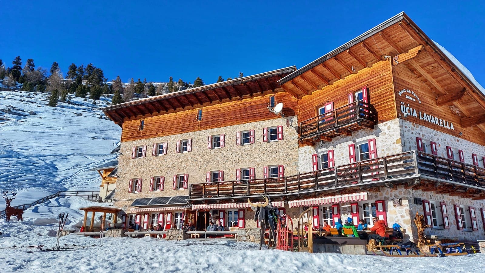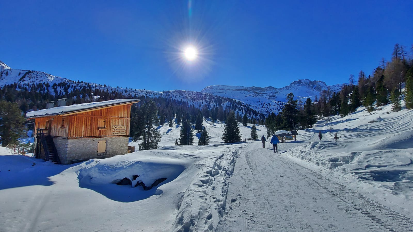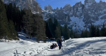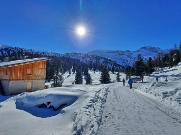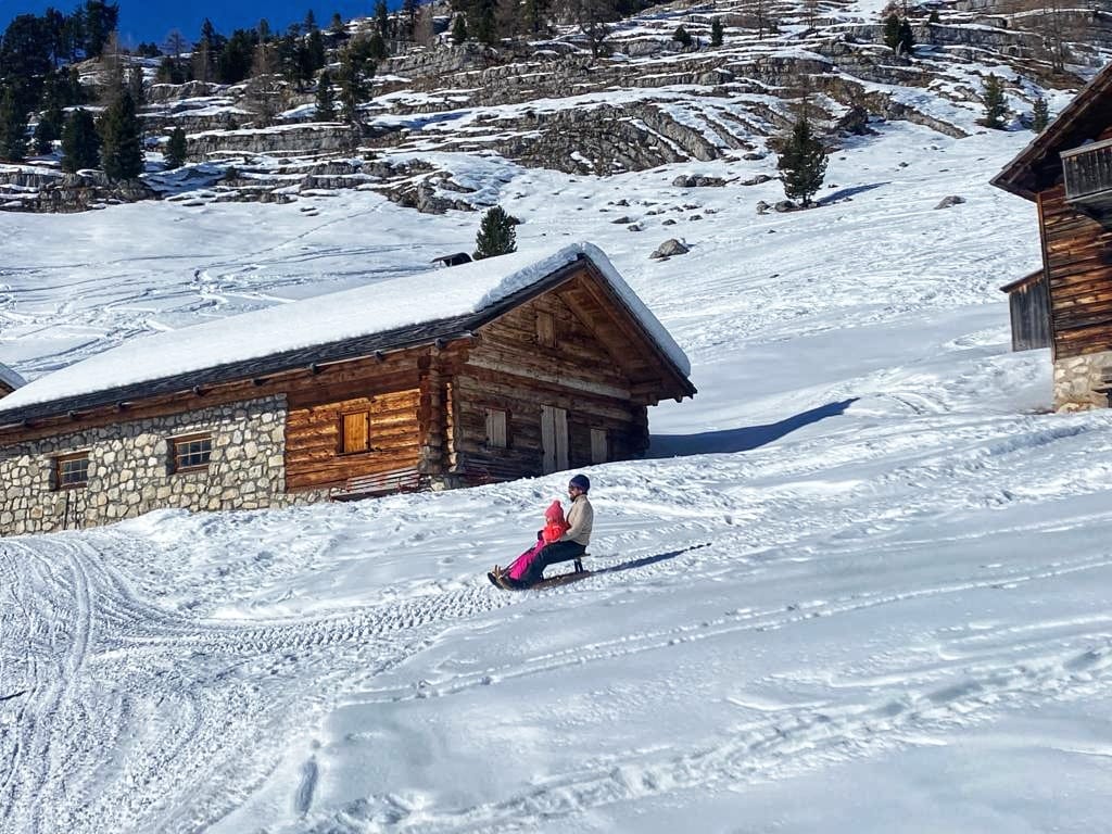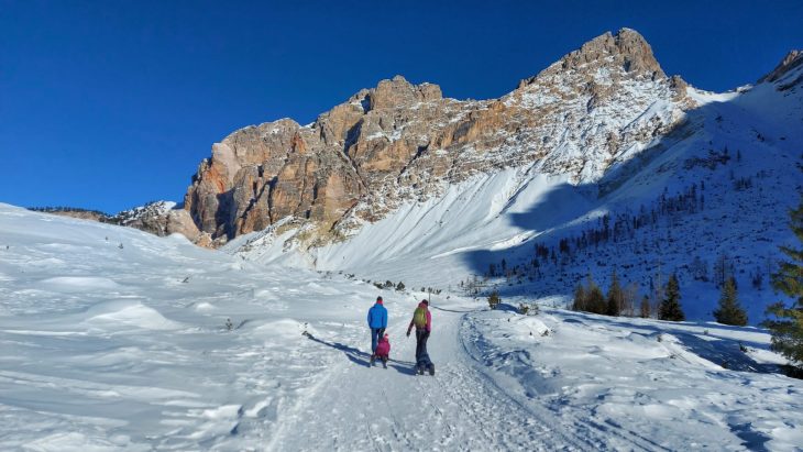 Una ventina di minuti d’auto dal delizioso paesino e si parcheggia gratuitamente nei pressi del Rifugio Pederù, a quota 1548 metri di altitudine. Qui ci si può fermare per colazione, così come a pranzo, e far divertire i bambini nel parco giochi all’aperto. Dal rifugio (dove si può anche dormire) parte la strada – sempre battuta in inverno – che porta in due ore abbondanti (anche di più con bambini abituati a camminare poco) e 550 metri di dislivello al Rifugio Lavarella, a quota 2050 metri.