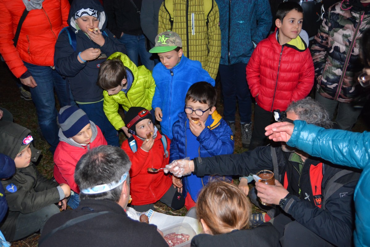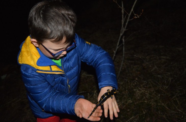 La felicità tocca il massimo quando scopriamo che la gita ha anche uno “spuntino di mezzanotte” (in realtà quando dallo zaino di Sandro escono pane, lucanica e Nutella sono appena le 22:45 ma l’effetto è lo stesso): una bellissima sorpresa. Il pic nic di notte in compagnia in mezzo a un bosco non ha prezzo e nemmeno il ritrovamento fortuito e quasi alla fine del percorso, di una bellissima salamandra. Affascinante. Divieto assoluto di toccarla (infranto immediatamente da Timothy purtroppo) e grande meraviglia per quel manto pezzato giallonero.