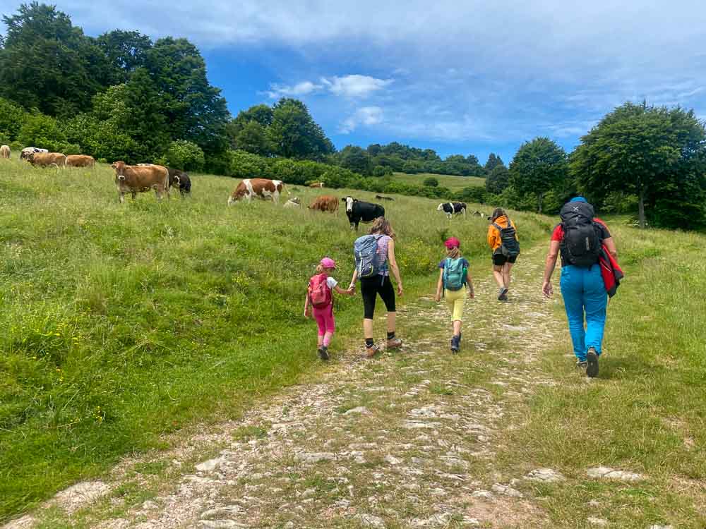 Dal parcheggio si prosegue a piedi su strada asfaltata fino a raggiungere il Camping al Faggio. Il percorso prosegue sterrato, attraverso grandi pascoli e paesaggi davvero suggestivi. Con un tocco di Toscana, tra colli dolci ed erba da sfalciare. Sempre in leggera salita si prosegue tra mandrie di mucche e poi su un piacevole saliscendi. Si passa in un bosco di faggi ed ecco che di lì a poco appaiono i cosiddetti “Busoni“.