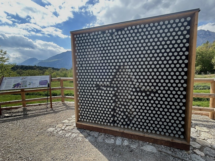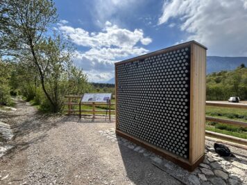 La terza postazione è un bel punto panoramico. Qui possiamo notare, osservandolo attraverso una grande cornice in legno, come l’uomo ha cambiato nel tempo il paesaggio.
