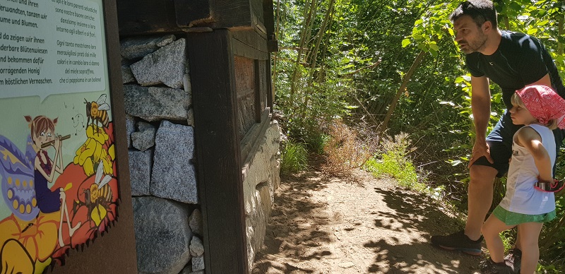 Dopo esservi fermati un po’ qui (oppure potete fare tappa al ritorno, così non avrete problemi a smuovere i pupi!) armatevi di un po’ di pazienza e salite verso la montagna, seguendo le indicazioni sul tabellone iniziale. Una decina di minuti ed ecco sulla destra l’imbocco del percorso. Il “Sentiero degli Elfi” è una facile passeggiata in parte nel bosco, adatta soprattutto nelle mezze stagioni. Si tratta di un percorso ad anello di circa tre chilometri (100 metri di dislivello, tutti all’inizio) adatto anche ai bimbi più piccini. Sconsigliamo di intraprenderlo in passeggino perchè alcuni tratti sono composti da scalinate e radici.