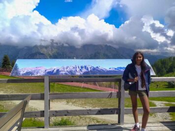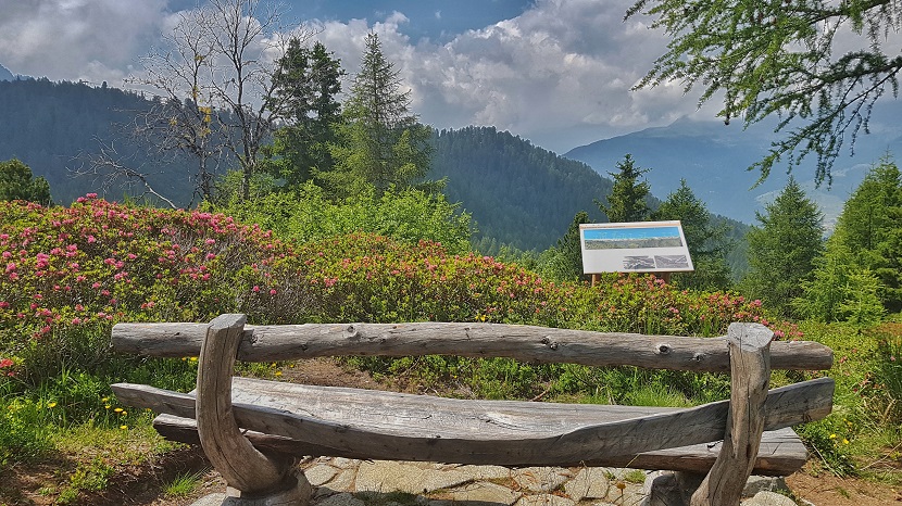 Raggiunto il primo punto panoramico, vi aspetta una panchina con una vista che spazia sul gruppo del Cevedale. Molto utile la tabella illustrativa con la segnalazione delle vette che si possono ammirare.