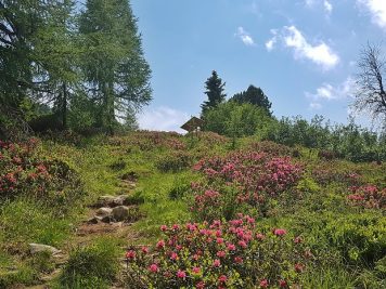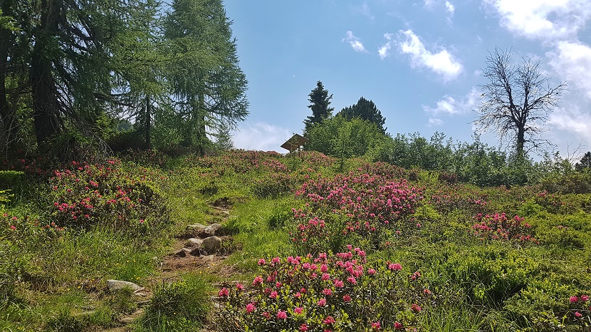 Arrivati in quota alla sinistra della malga troverete il pannello illustrativo che segnala il punto di partenza del Sentiero dei Pastori. Il primo tratto è in salita (circa 150 metri di dislivello), ma non preoccupatevi perché poi tutto il sentiero prosegue con leggeri saliscendi fino al Lago delle Malghette. Il sentiero è molto carino e ben tenuto e man mano che il bosco si apre cominciamo a passeggiare circondati da bellissimi rododendri fioriti.