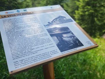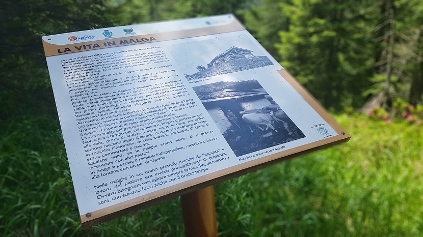 Lungo il percorso potete trovare alcune interessanti tabelle illustrative che spiegano com’era scandita la vita in malga, il sistema turnario delle malghe da latte, il personale che si occupava dei vari compiti, l’importanza della transumanza… davvero interessante anche per i bambini, che apprezzeranno sicuramente anche le illustrazioni a forma di mucca che ci parlano delle varie specie.