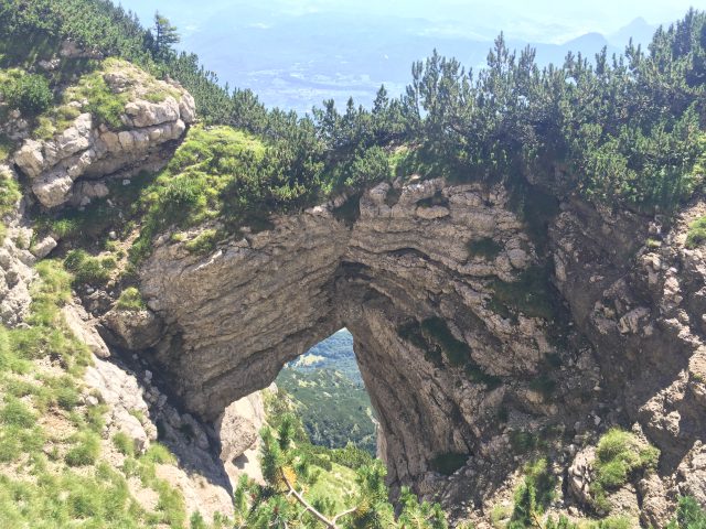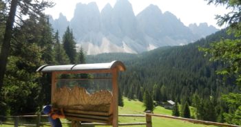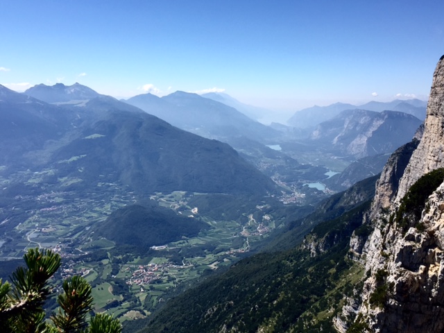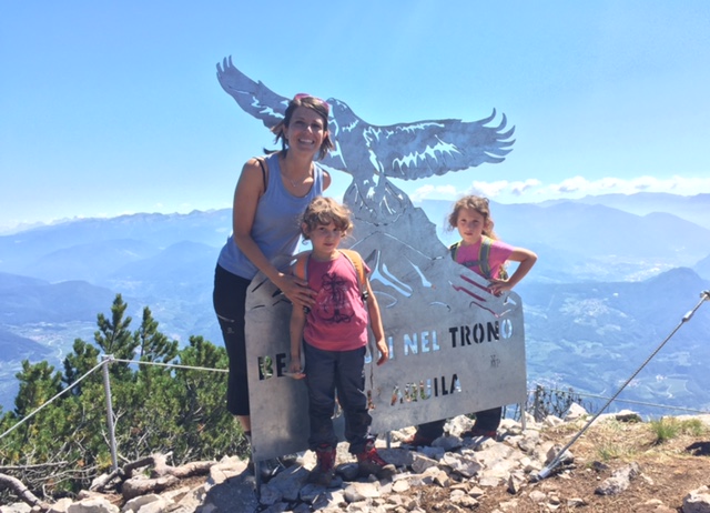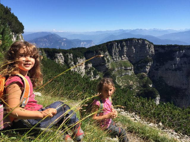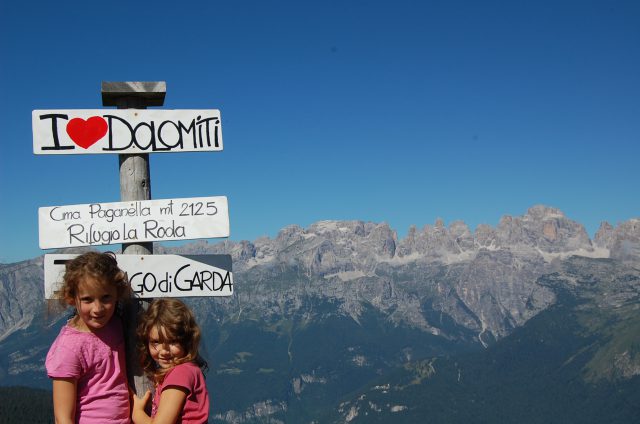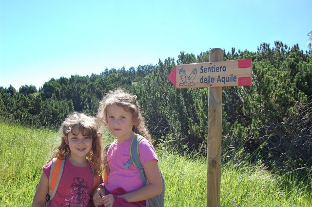 Il Sentiero delle Aquile, in cima alla Paganella, è un percorso in quota davvero suggestivo. Per gli adulti c’è una ferrata spettacolare (con tratti esposti e ben due ponti tibetani, una delle poche raggiungibili comodamente con gli impianti), che noi abbiamo osservato a bocca aperta tenendoci ovviamente a debita distanza. Anche il sentiero è adrenalinico: il primo tratto è attrezzato con scalette e cordini, e necessita di particolare attenzione. Ho provato a percorrerne un tratto con Alice, 5 anni, e sua sorella Giulia, 8, e quando ho visto che erano tranquille e sufficientemente attente ho deciso di proseguire. Abbiamo così suonato la “Campana dei Sogni” (una campanella vera), ammirato quella meraviglia naturale soprannominata “l’arco di Tito” e poi siamo entrate nella grotta con la “Fonte della Giovinezza”, toccando anche l’acqua magica perché non si sa mai che funzioni davvero! Le ragazze erano emozionate e contente di mettersi alla prova su questo itinerario così inusuale: mai una lamentela, un sussulto di paura, così come niente disubbidienze rispetto alle mie indicazioni. Quando erano stanche una piccola sosta con vista e voilà! Già, perché la vista che si può godere da lassù è davvero incredibile: sotto di noi la Valle dell’Adige in tutta la sua bellezza, mentre a destra e quindi a sud una serie di magnifici laghi (entrambi i laghi di Lamar, con il loro azzurro-verde inconfondibile, quelli di Cavedine, Toblino e Santa Massenza, per finire con il Lago di Garda!). Il secondo tratto è più tranquillo, con un continuo saliscendi tra i mughi fino ad arrivare al “Trono delle aquile”, dove si può fare a finta per un momento di guardare sotto ed aprire le ali. Due le alternative per il ritorno: percorrere il Sentiero Botanico e al bivio scendere a destra fino al rifugio Dosso Larici (la soluzione migliore per chi viene da Fai e poi riprendere le seggiovie) oppure tornare a sinistra in un’ora circa di nuovo in cima alla Paganella, dove vi aspetta il rifugio La Roda ed il suo impareggiabile balcone sulle Dolomiti di Brenta.