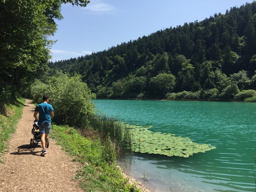 Strada percorribile tranquillamente con il passeggino da città e anche con la bicicletta. Nota importante: in entrambi i laghi l’acqua è freddina, ma decisamente rigenerante!