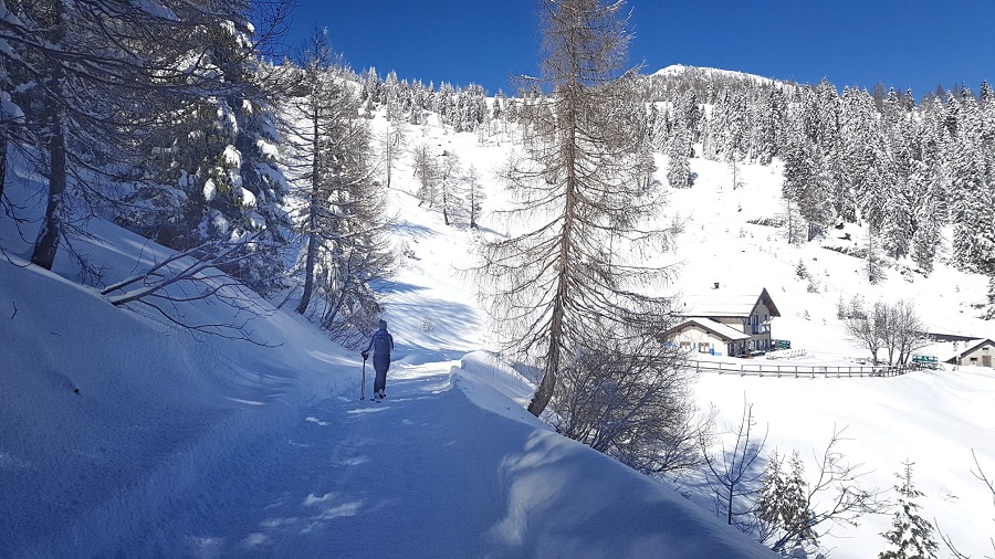 Con bambini piccoli mettete in preventivo almeno un’ora e un quarto di passeggiata. Una volta arrivati alla malga, se non siete troppo stanchi vi consigliamo, neve permettendo, di proseguire fino al punto panoramico de La Bassa.