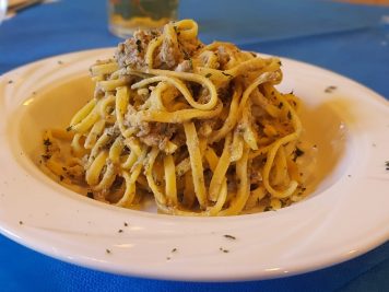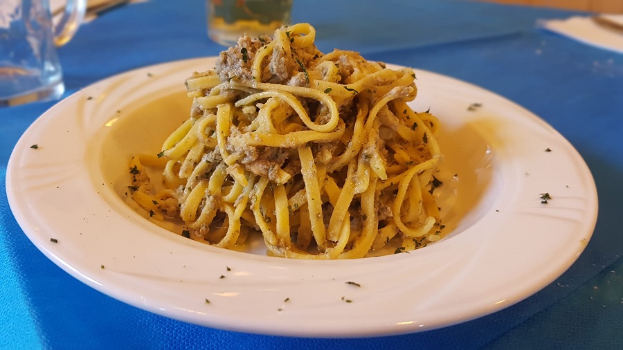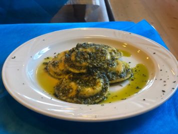 Ritornando alla malga per il pranzo, troverete un’ottima scelta di piatti tipici e anche rivisitati con un tocco di creatività. Particolarmente apprezzati i formaggi della malga e i primi. Noi abbiamo assaggiato i ravioli con formaggi e noci al pesto di rucola e speck e gli spaghettoni alle sarde fresche (una volta scoperto che il cuoco è anche un abile pescatore, non si poteva non provare questo piatto che viene proposto in malga in alcune occasioni).