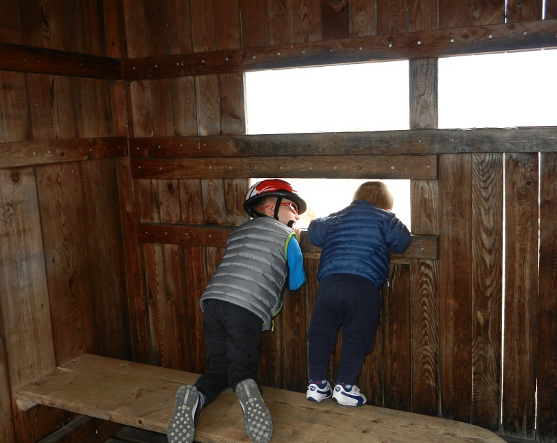 Per i più grandi è possibile muoversi anche in bicicletta. Lungo la strada abbiamo incontrato un osservatorio di uccelli acquatici, una costruzione in legno con tanto di terrazza che i bambini hanno subito conquistato come fosse un fortino, divertendosi ad osservare il paesaggio dalle finestrelle e fingendo di avvistare potenziali nemici.
