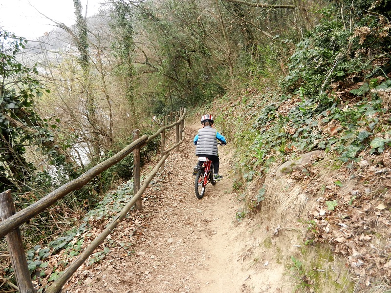Siamo quindi giunti sulla strada principale, asfaltata, che fiancheggia comodamente il lago; noi però abbiamo preferito prendere il sentiero sterrato, in leggera salita in alcuni punti (percorribile anche con il passeggino), che passa sopra, permettendo così ai nostri piccoli bikers di sperimentare un nuovo tracciato (senza doversi preoccupare delle auto) e a noi adulti di godere di una vista sull’intero lago e sulle colline circostanti.