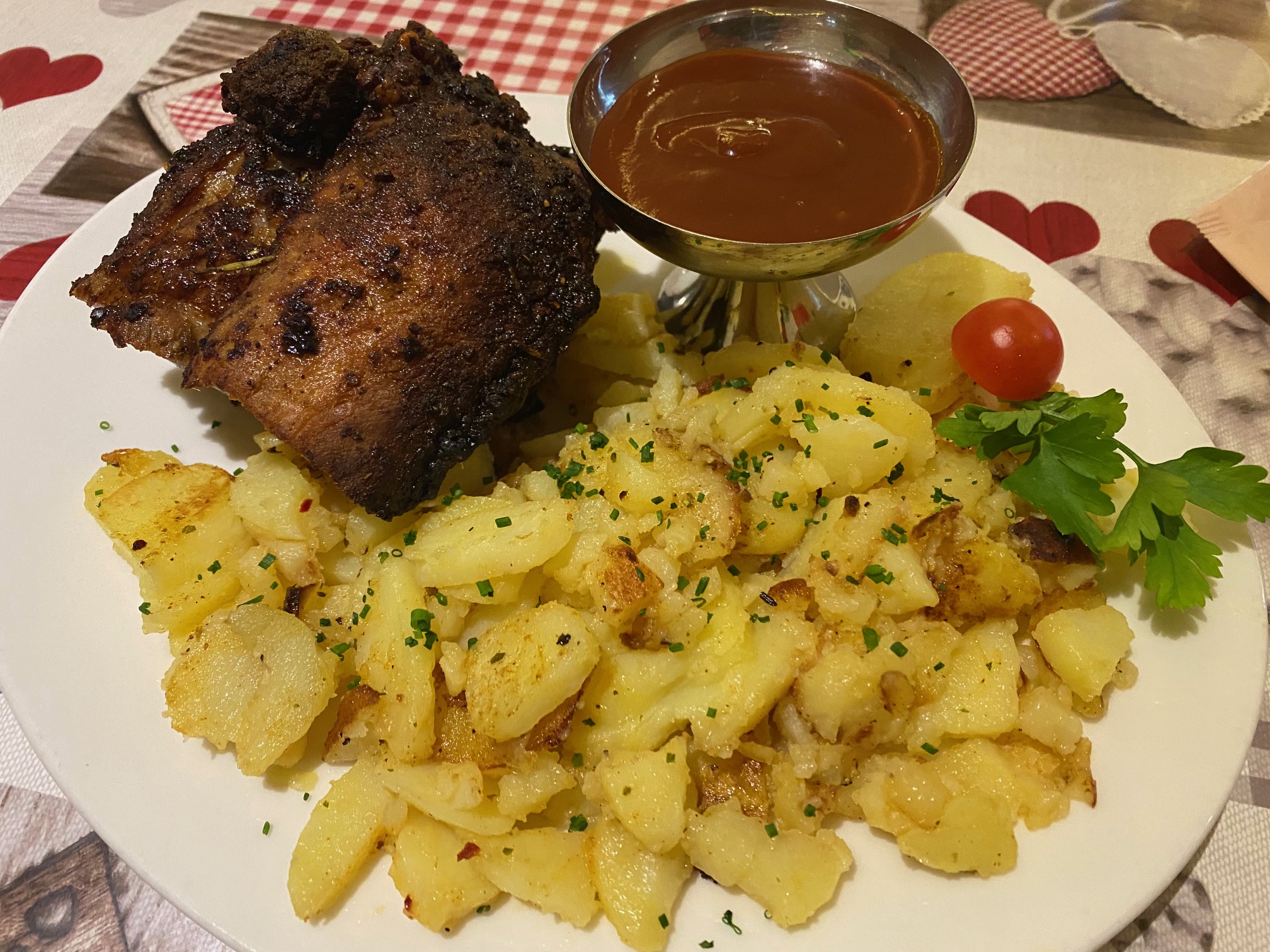 Il Rifugio sorge nella conca del Gardeccia: alle sue spalle il bosco e la meraviglia e il silenzio delle vette. Immerso nella natura e nella tranquillità in realtà in rifugio, da poco restaurato, è dotato di ogni comfort ed offre, soprattutto, un menù da leccarsi i baffi. Qui sotto le nostre costine con patate saltate….
