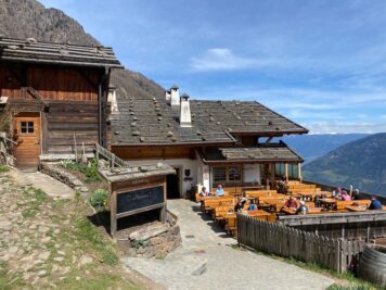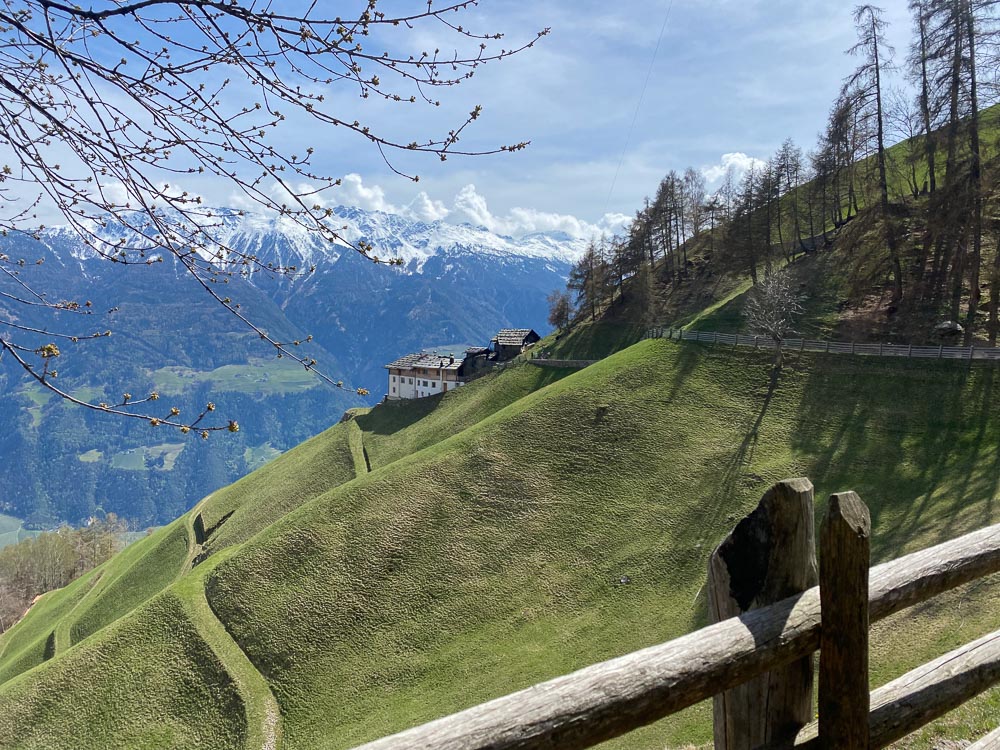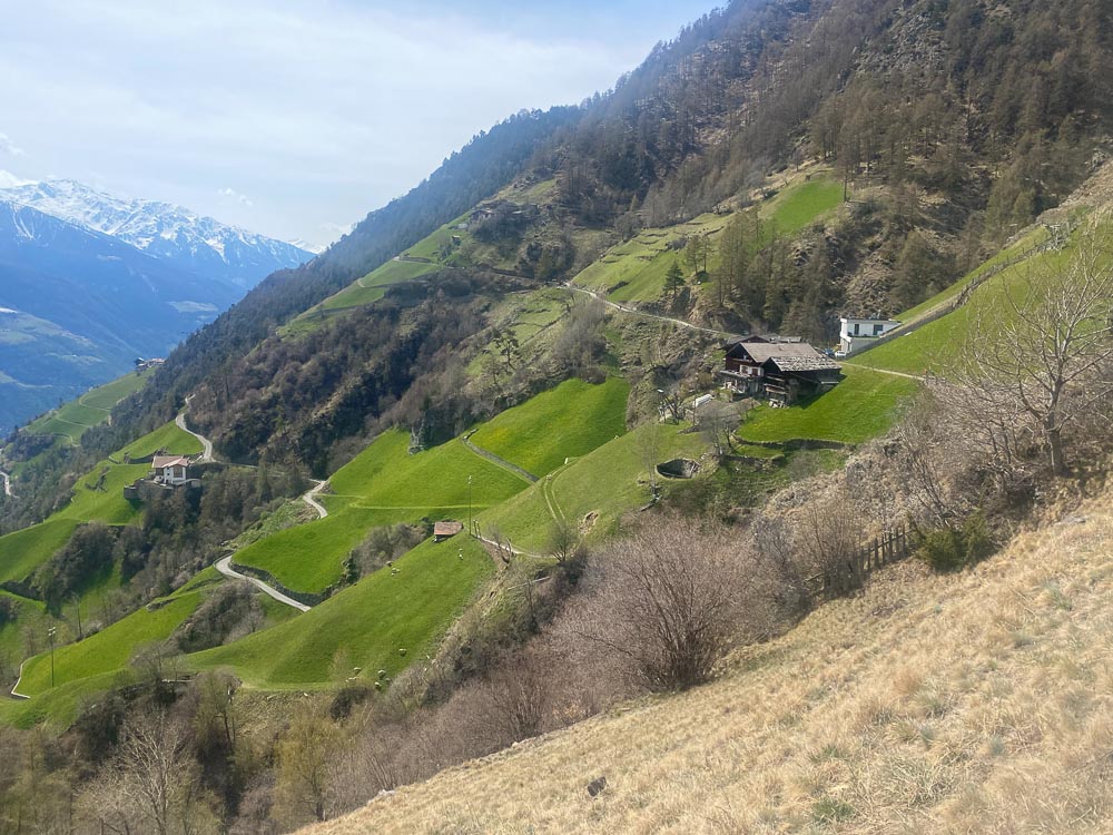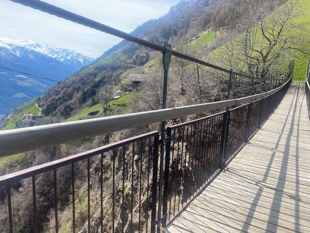 Potete poi proseguire in piano lungo l’Alta via di Merano, in direzione Funivia Texel. In mezz’ora arriverete ad un altro punto di ristoro: il Galmein Hof. Oppure proseguire per altri venti minuti, passando dal ponte sospeso, fino a Maso Pirch (1445 metri).