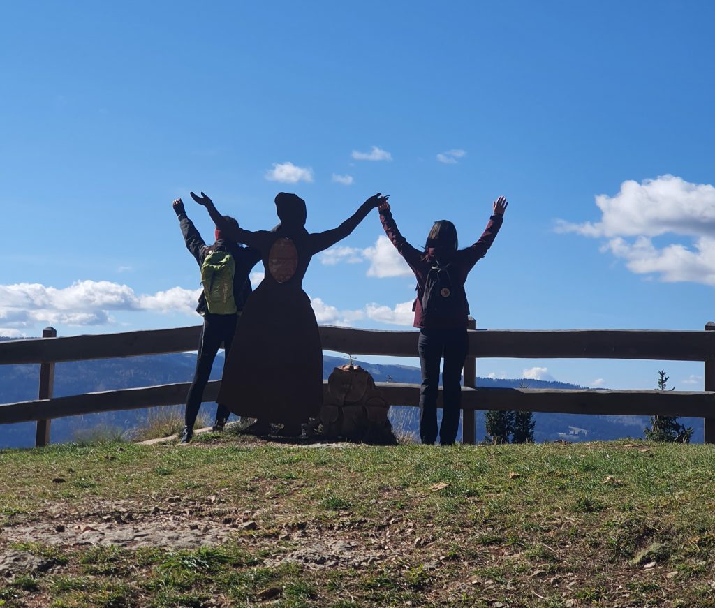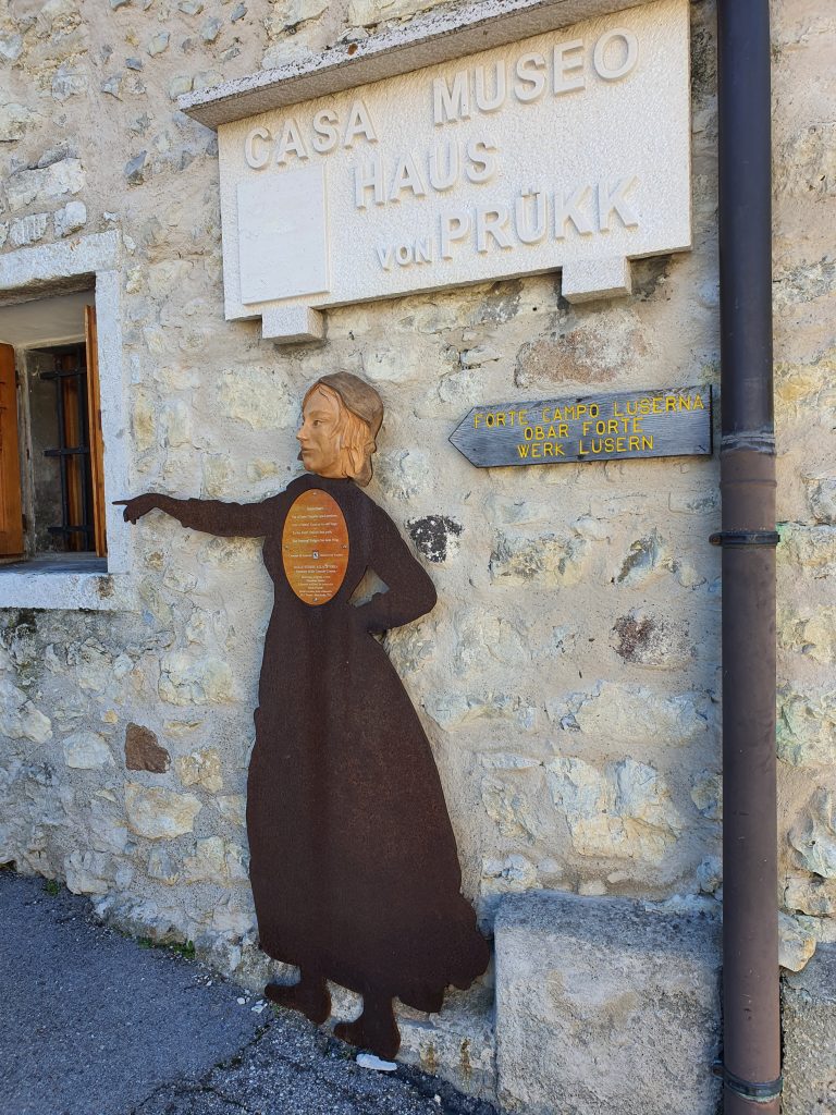 Con questo approccio, dopo circa un’oretta e mezzo si arriva a Forte Campo (1.540 metri slm), imponente struttura che sicuramente merita una visita (aperto da giugno a settembre) e, dopo poco, agli avamposti Oberwiesen e Viaz, dove si viene accolti dalla figura di Lena, con le braccia protese verso il cielo, che racconta il suo ritorno a Luserna.