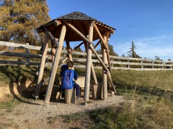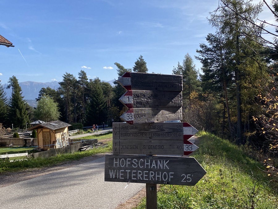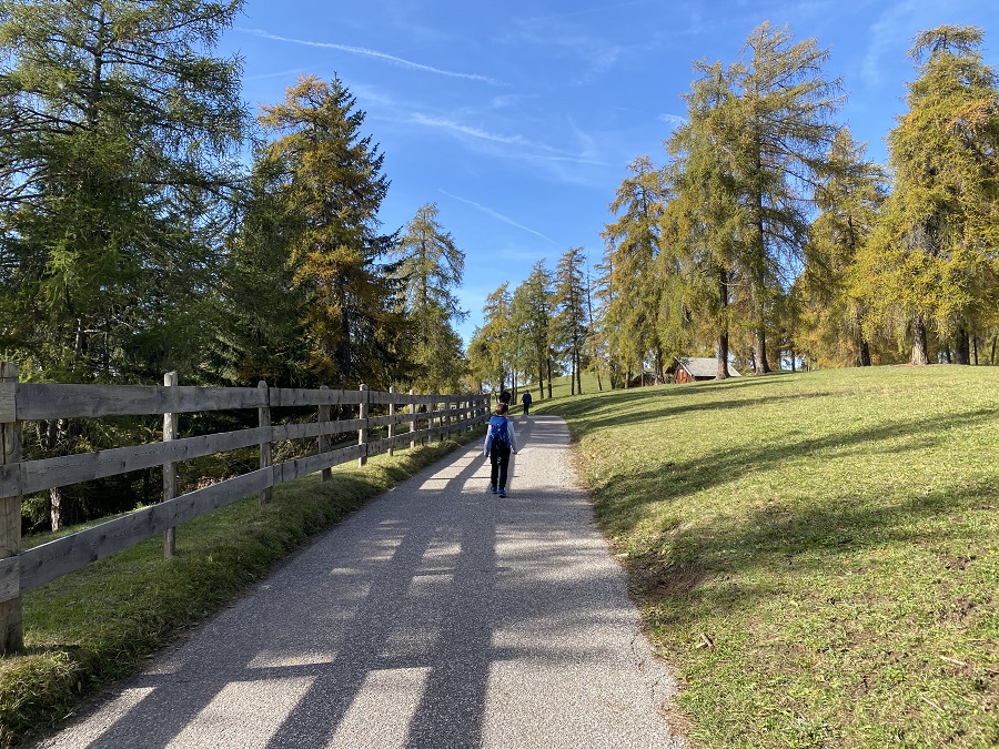 Dall’Edelweiss seguiamo inizialmente il sentiero E5, su strada asfaltata e in discreta salita. In circa mezz’ora arriverete sull’ altipiano del Salto. Da qui si prosegue sul sentiero numero 7. Il percorso è sempre ben segnalato. La vista si apre e si respira già un’atmosfera unica. Cavalli al pascolo, graziose baite in legno e maestosi larici, bellissimi con i colori autunnali ma anche in primavera. Siamo stati in questi posti diverse volte perché sono davvero meravigliosi in ogni stagione, leggete San Genesio: Altipiano del Salto.
