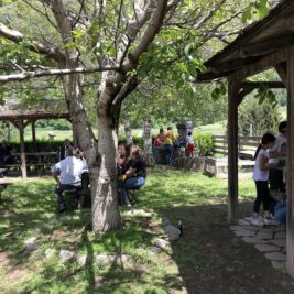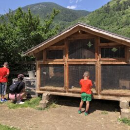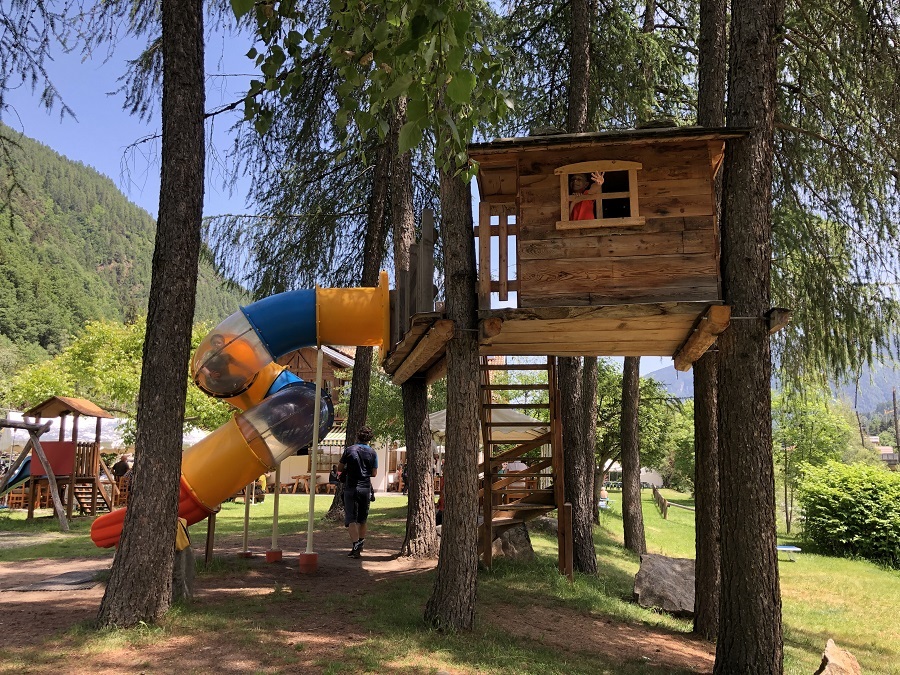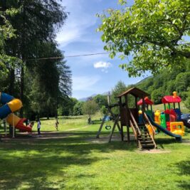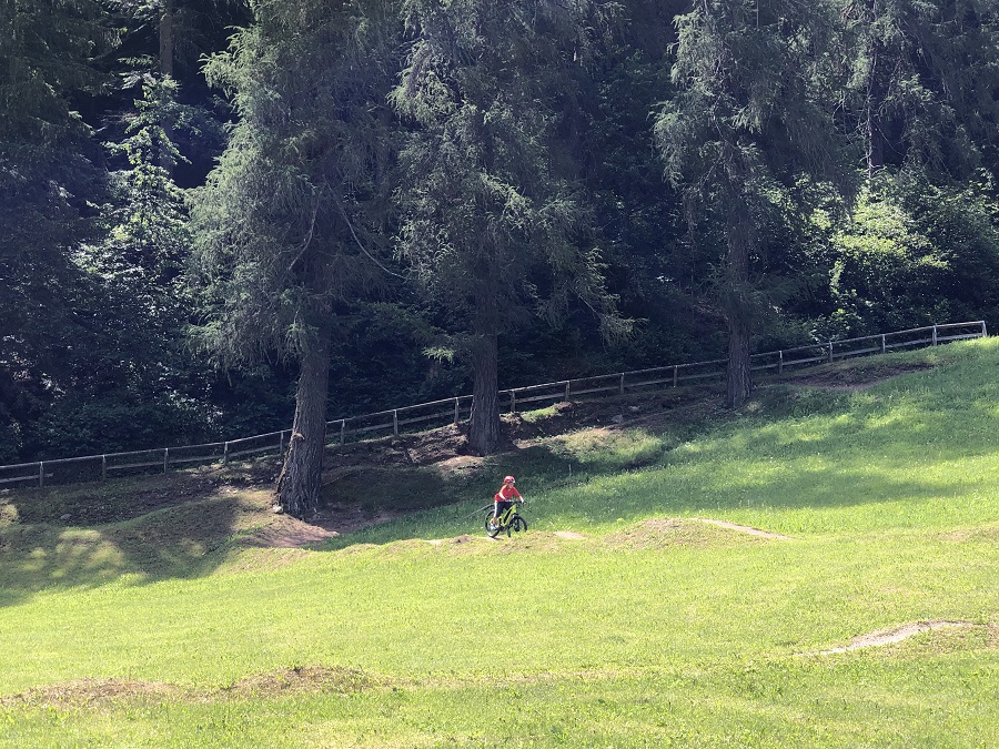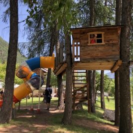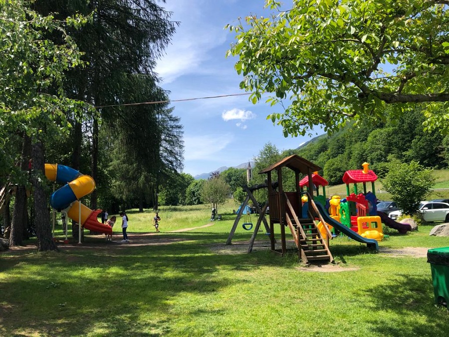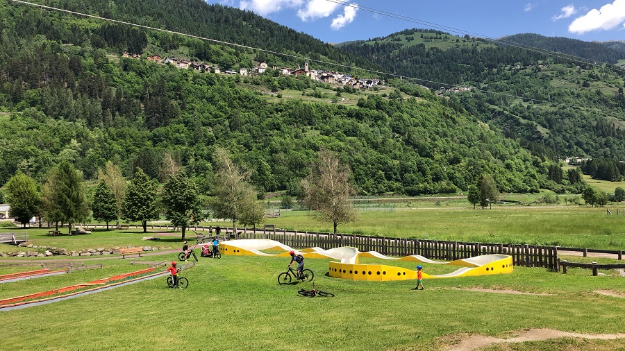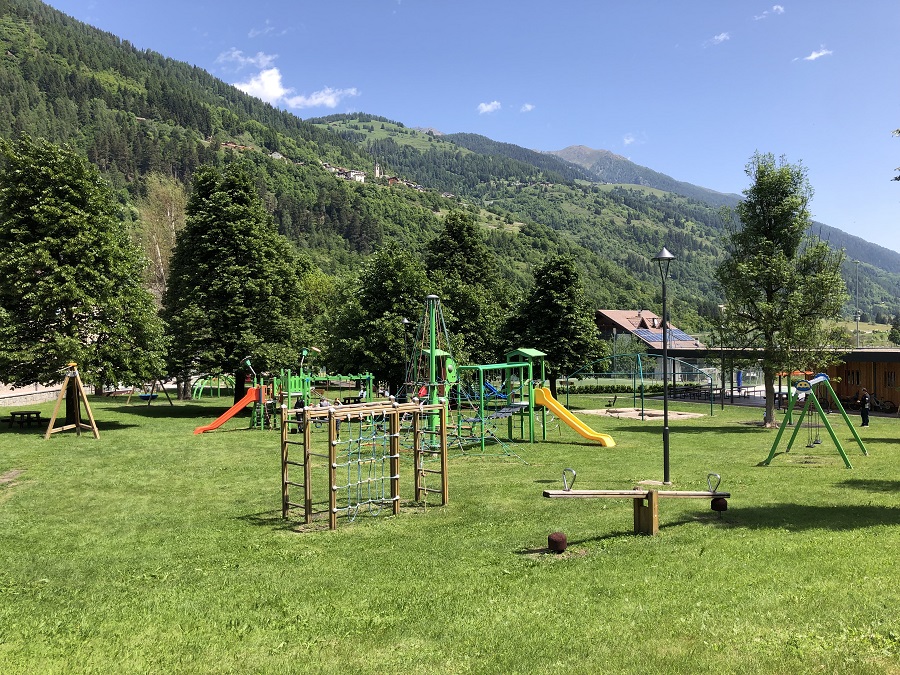 Scendiamo in bicicletta lungo il paese di Ossana e Pellizzano e ritorniamo in ciclabile dove troviamo il grande parco giochi di Pellizzano, dove ne approfittiamo per uno spuntino.