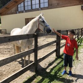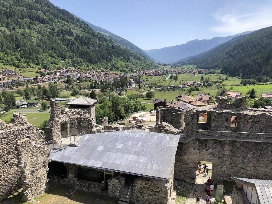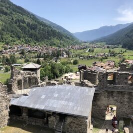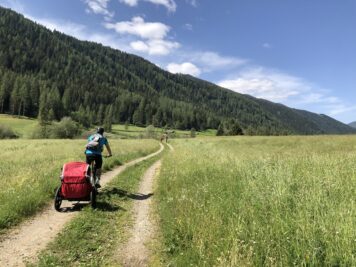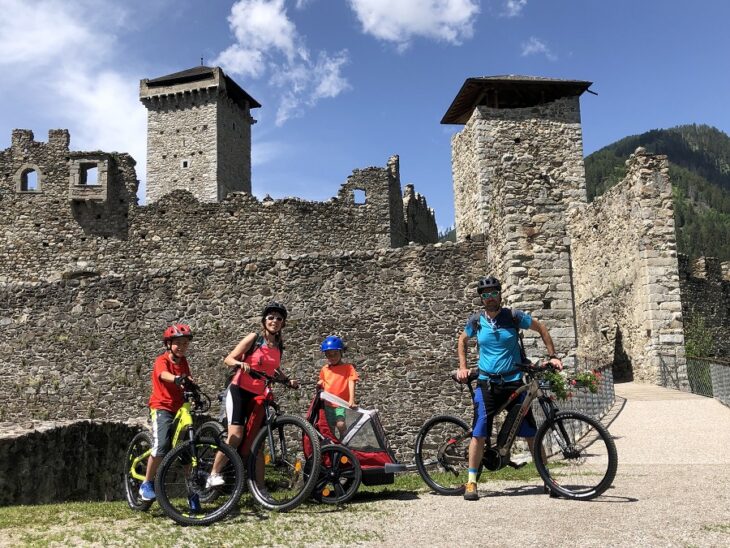 Abbiamo lasciato la macchina nell’ampio parcheggio del centro noleggio, zona strategica per l’entrata diretta in ciclabile ed ecco Marco e Giorgia già indaffarati a prepararci le biciclette per la super pedalata di oggi. Immancabile il carretto da attaccare alla bicicletta per il nostro Simone (5 anni) che voleva godersi il panorama in relax. L’obiettivo è arrivare al Castello di Ossana, senza farci mancare diverse soste per curiosare le bellezze della valle.