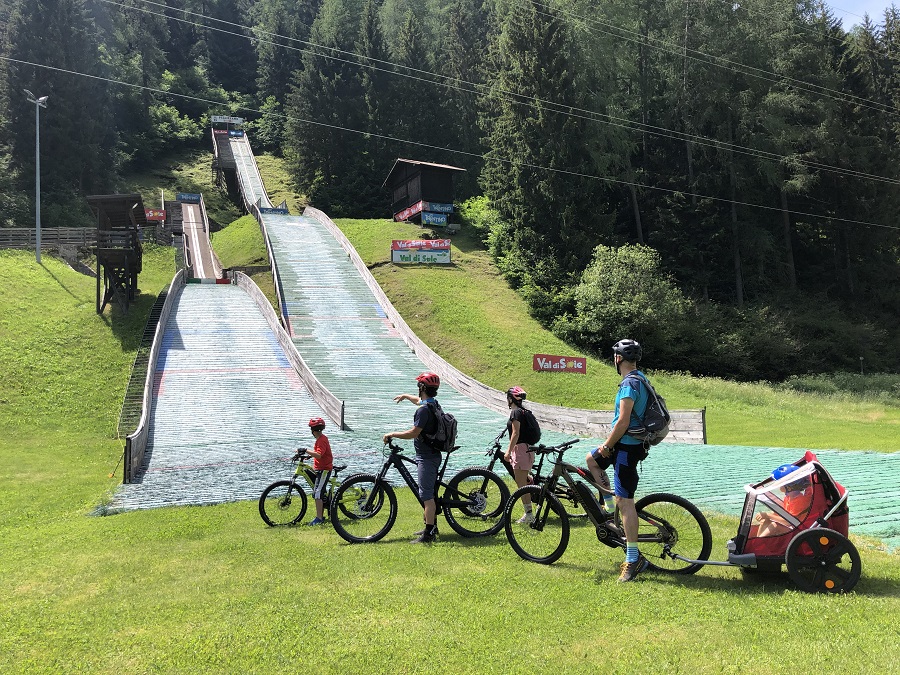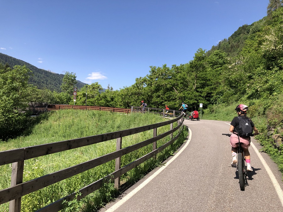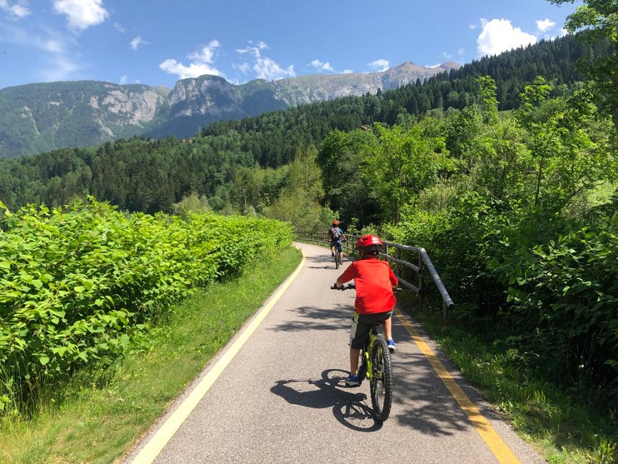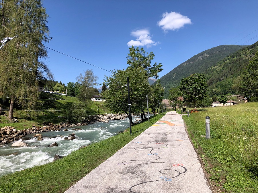 Il percorso è tutto di saliscendi mai troppo impegnativi, praticabili anche con la bicicletta muscolare senza troppa difficoltà. Arrivati a Mezzana, all’altezza della stazione ferroviaria vi consigliamo di percorrere un pezzo di ciclabile che oltrepassa il ponte e si sposta dall’altro lato del fiume, sarà bellissimo ammirare i disegni che troverete lungo la strada. Alla fine di questo tratto ci sarà possibilità di divertirvi con lo sci estivo, vi vedrà impegnati in una breve discesa con porte da slalom (aperto da metà giugno).