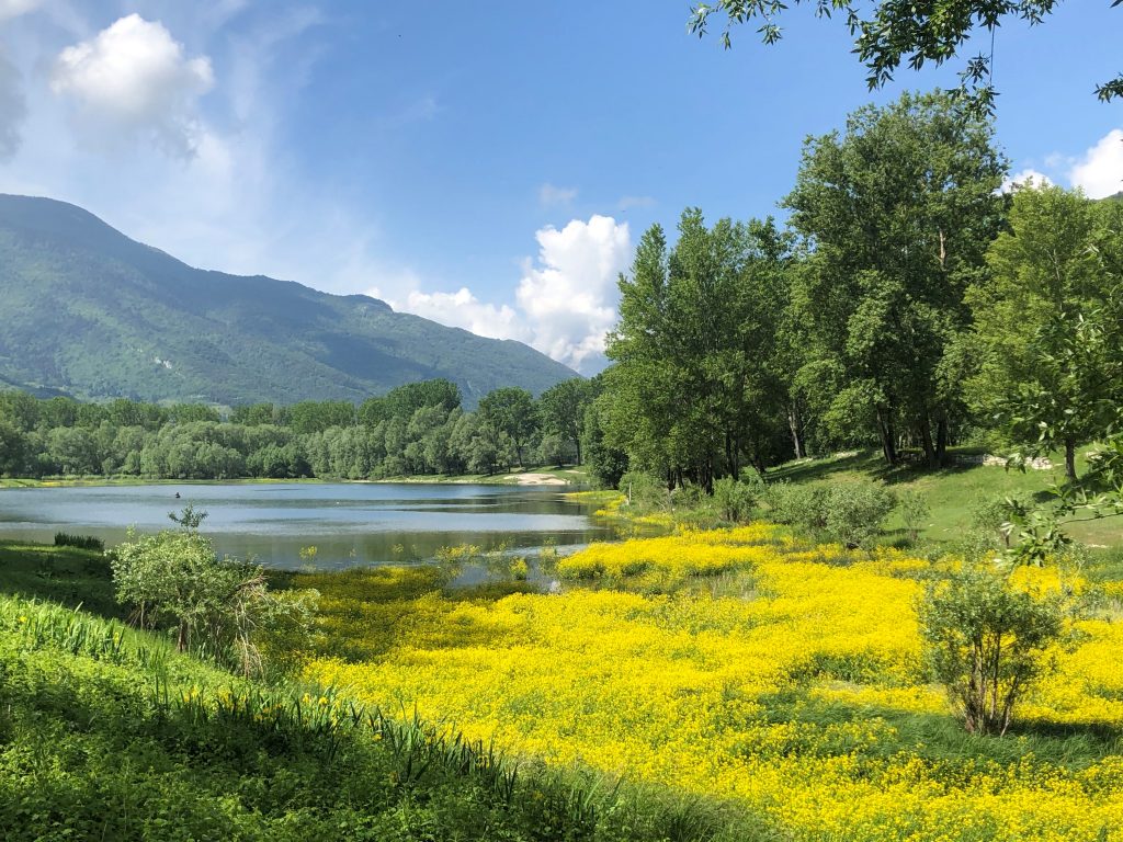 Potete proseguire sulla ciclabile asfaltata oppure, arrivati al piccolo ponticello (dopo circa 100 metri dalla partenza) si può deviare sulla sinistra per un piccolo sentiero che si abbassa un po’ avvicinandosi alle rive del lago. Qui si trovano zone nascoste dagli alberi dove i bambini possono divertirsi a giocare agli esploratori.