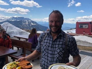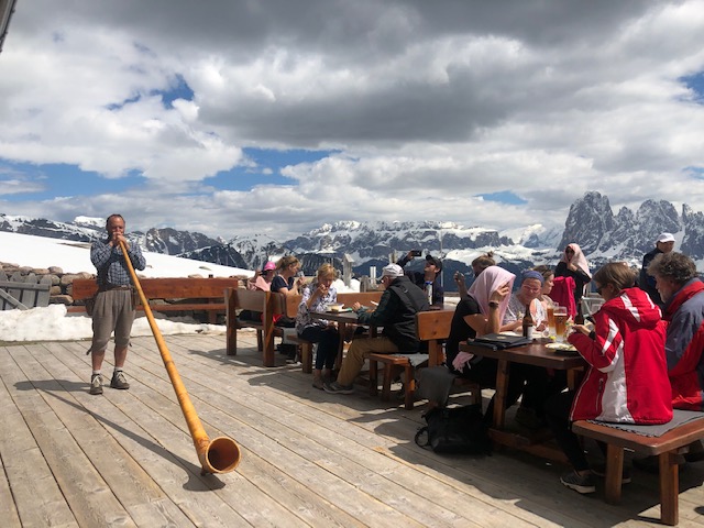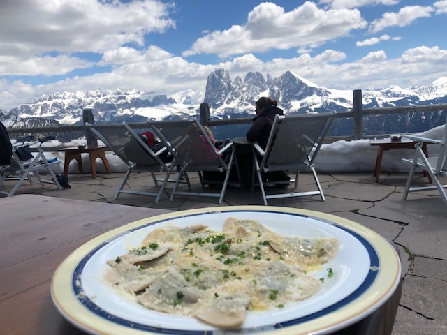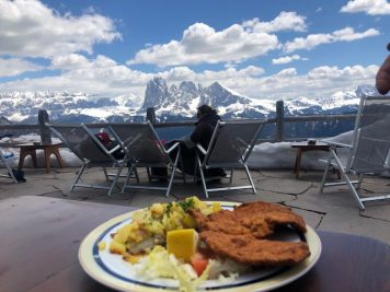 Bello anche all’interno, il punto forte è sicuramente la terrazza panoramica con vista sulle Dolomiti. Una favola da godere sulle numerose sdraio. David ci ha anche allietato con un po’ di musica tradizionale, per completare questo quadretto delizioso.