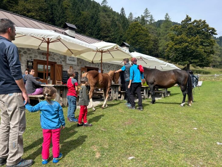 Prima di salutarci abbiamo fatto tappa alla carinissima Malga Nambi, un posticino davvero di altri tempi: piccolina, adornata dai gerani e circondata da un bel prato dove pascolavano in libertà una mamma cavallo con il suo puledrino, vi regalerà un tuffo al cuore. Qui non c’è elettricità e nemmeno acqua calda: le bibite sono messe in fresca nella fontana e tutto segue un ritmo più lento ed autentico. I piatti sono pochi (la scelta è tra piatto unico con polenta, formaggio, spezzatino, fagioli e cavolo cappuccio, il tagliere con formaggi di malga e salumi e il panino Nambino – da provare, con pesto di aglio orsino, speck, formaggio, cipolle e noci del Bleggio-) ma buoni e i dolci hanno tutto il sapore delle merende della nonna ( yogurt di malga, polenta e zucchero, pane burro e marmellata). Da bere acqua della Val d’Algone, succo di mela, birre artigianali, vini trentini e caffè fatto con la moka. Ci si può sedere ai tavoli esterni o dentro. Se ne avete occasione prenotate una cena qui: la saletta interna è un bijou e tutto si svolge al lume di candela! (Malga Nambi: tel. 346.3551530)