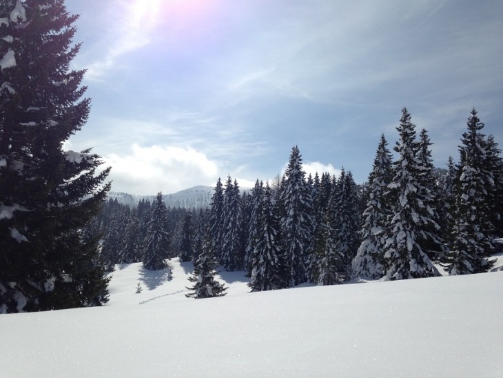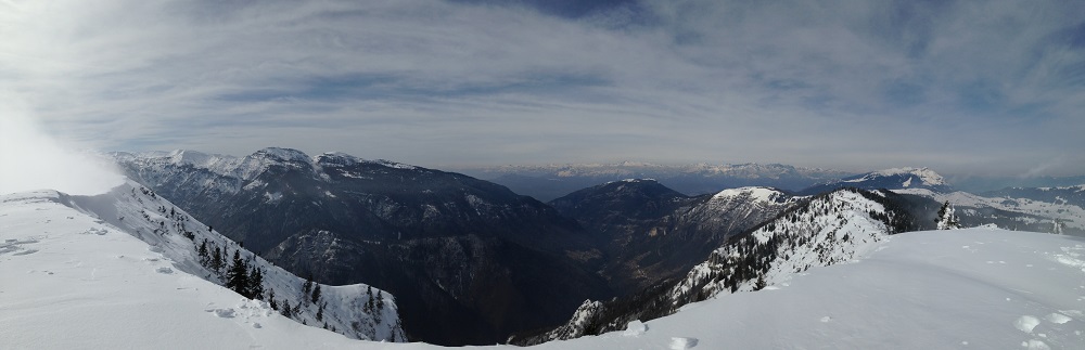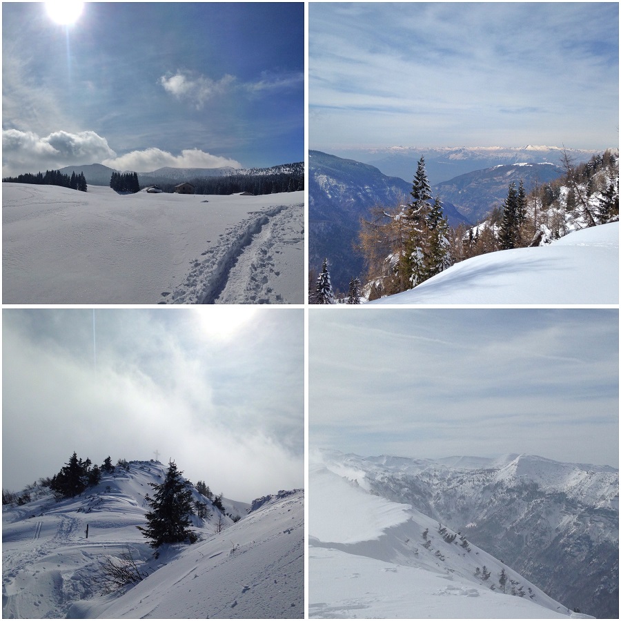 Passo dopo passo ci troviamo letteralmente immersi in un paesaggio meraviglioso, dove risaltano le sconfinate distese di abeti innevati e cominciamo ad intravedere la grande croce posta sulla cima del Monte Maggio. Risalendo la cresta della montagna troverete alcuni tratti esposti, ma basterà proseguire sul sentiero e raggiungerete la vetta in tutta sicurezza in circa 1 ore e mezza di camminata. Purtroppo, come accade spesso in montagna, proprio mentre raggiungiamo la cima ci troviamo a dover fare i conti con un po’ di nebbia che ci permette di vedere il panorama solo a sprazzi. Nonostante ciò il colpo d’occhio è sicuramente spettacolare: dal Pasubio alle Dolomiti di Brenta fino alla catena del Lagorai si gode di una vista a 360°.