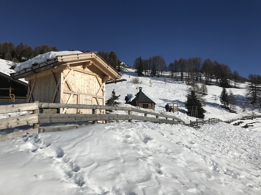 Circa a metà discesa si passa per la malga Sunnolm dove ci si può fermare per pranzo o per bere qualcosa di caldo. Noi abbiamo fatto merenda con vin brulè, cioccolata calda e una buona fetta di strudel, ma si possono anche ordinare piatti della tradizione sudtirolese uno più buono dell’altro. Mentre gli adulti possono stare comodamente seduti ai tavoli godendosi il tepore del sole invernale i bambini possono giocare sulla neve scendendo dalle piccole discese intorno al ristorante o giocando nel parco giochi davanti.