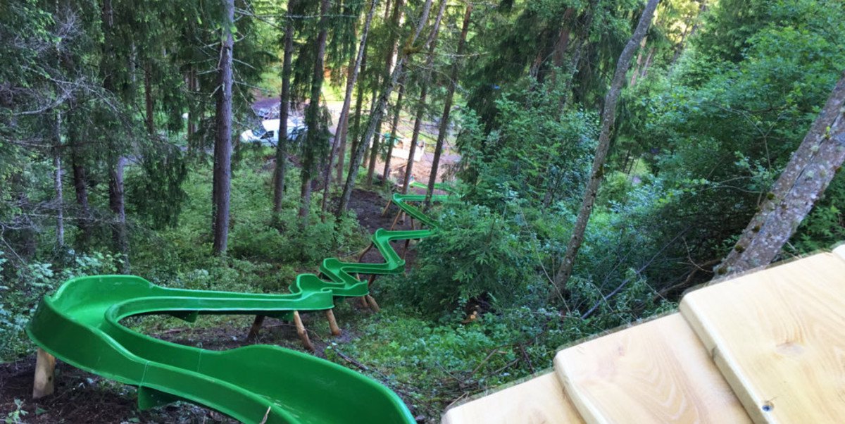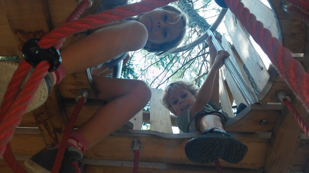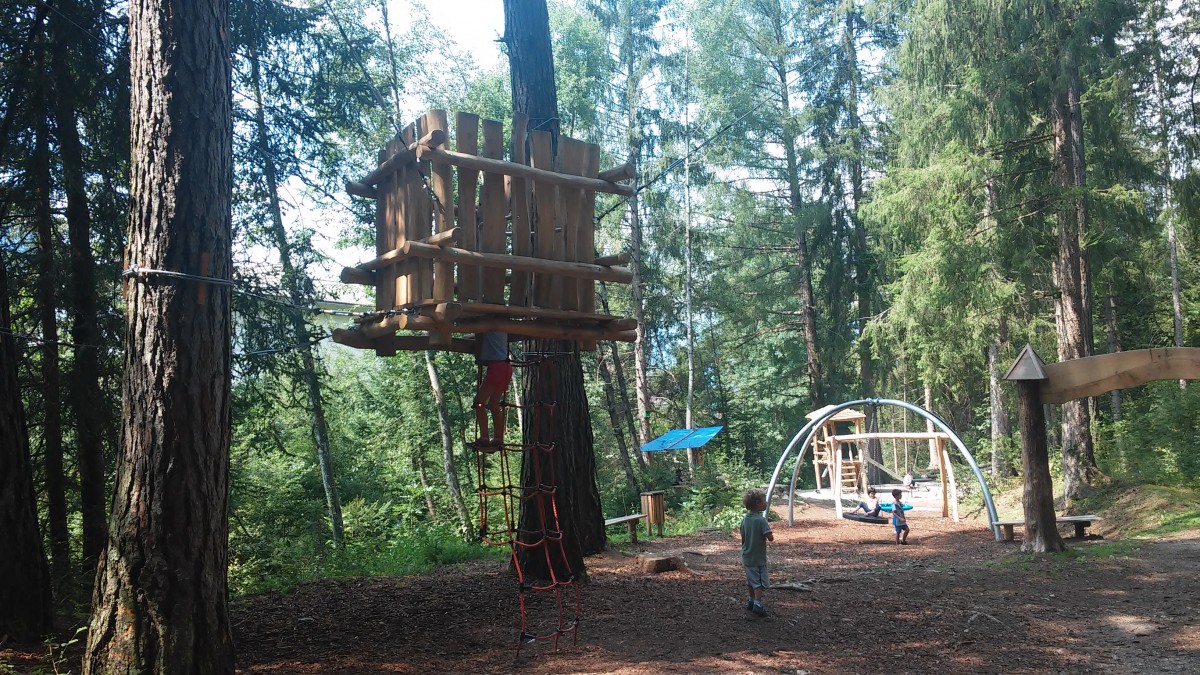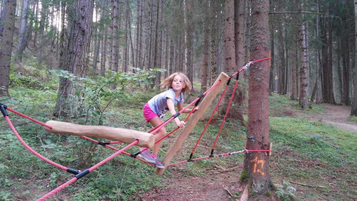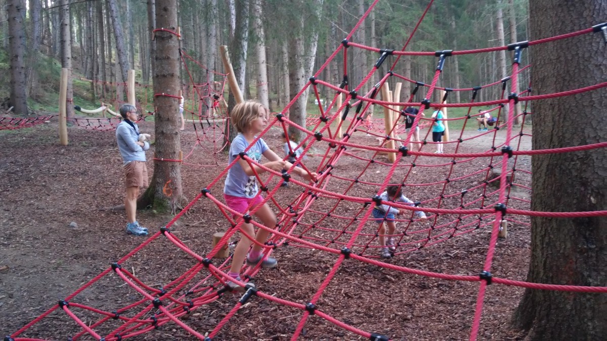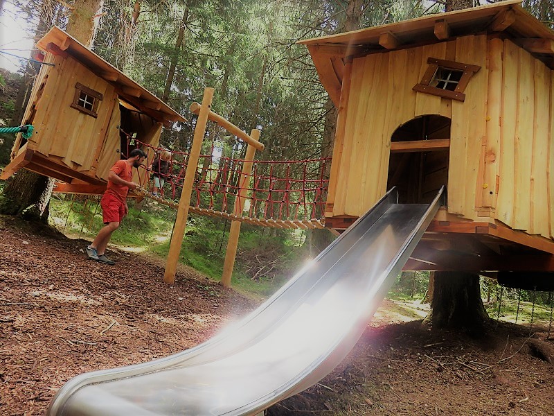 Tornate ora proseguite e lasciate alle spalle l’area acqua, vi troverete ben presto nel magico bosco del Kinderwelt con un’altra bella attrazione: le casette sospese con corde e scivoli per salire e scendere.
