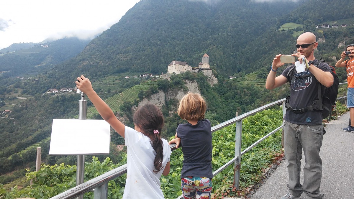 La strada che porta a Castel Tirolo è chiusa al traffico: le auto possono essere parcheggiate nei parcheggi pubblici del paese. La passeggiata fino al castello si può fare con il passeggino, ma poi va lasciato all’entrata in quanto l’interno è pieno di ciottoli e scale.