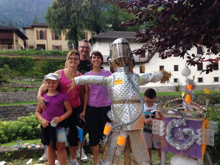 Inutile nasconderlo. Siamo rimasti un po’ delusi. Forse il nostro spaventapasseri era un po’ troppo futuristico perché venisse compreso dalla giuria 😉 Ma è stata comunque una bellissima giornata. Partiamo dal principio: stamattina siamo partiti alla volta di Marter di Roncegno, destinazione: la Casa degli Spaventapasseri/ Mulino Angeli, un luogo sempre molto carino dove portare i bambini e dove durante l’estate organizzano interessanti attività per i più piccoli come “fare il pane con i cereali dimenticati”,  “laboratori con materiali di recupero”,  “biodiversità a misura di bambino”  e “giochi col legno per conoscere la biodiversità animale”. Oggi però si teneva la festa clou dell’estate: una gara a cui tutti potevano partecipare costruendo il proprio spaventapasseri. L’organizzazione metteva a disposizione il supporto, cioè la croce in legno e la paglia. Era da tre anni che sognavo di partecipare e solo l’amicizia con la Manu poteva trasformare il mio sogno in realtà. Così io e Samuel, la Manu, suo marito “Santo Patrick”, Timothy e Sophie ci siamo sbizzarriti con uno spaventapasseri SPAZIALE con tanto di astronave, bombole dell’ossigeno, zainetto/razzo e stelle/pianeti/luna penzolanti nell’orbita stellare. Due ore di duro lavoro, divertendoci un sacco. Bellissimo vedere attorno a noi famiglie, gruppi di amici, fan de Il Trentino dei bambini (!), grandi e piccoli, partecipare entusiasti con in sottofondo l’animazione dei nostri amici Gli Strani Elementi tra trucchi, canzoni e super spaventapasseri sui trampoli. In attesa di sapere il giudizio della giuria, ci siamo diretti in paese alla Festa della Polenta, ma le cucine aprivano solo alla sera…e allora che fare? Abbiamo deciso di salire un po’ verso la località Ronchi, al ristorante “Alle Pozze”! Ci si mette  una ventina di minuti, su comoda strada asfaltata nel bosco, e si arriva a quota 1400 metri in un posto che parla solo di baite, natura e prati sconfinati. Il ristorante è a misura di famiglia: fasciatoio, giochi, mini tavolini per i bimbi, ampio prato su cui possono giocare sotto gli occhi degli adulti e alcuni animali da cortile tra cui delle simpatiche oche e galline. Cucina tipica trentina, tutto preparato in casa a partire dall’ottimo pane con le noci e la focaccia, sapori intensi e gustosi (forse solo un po’ cari alcuni secondi, ma non si può avere tutto!) e ottima ospitalità. Dopo pranzo ci siamo rilassati sulle sdraio, i bimbi hanno giocato arrampicandosi sugli alberi e su un grande sasso, poi piano piano siamo tornati a casa. Volendo c’è una passeggiata facile, di una ventina di minuti, che porta ad un laghetto. Oggi eravamo un po’ di corsa…ma torneremo!