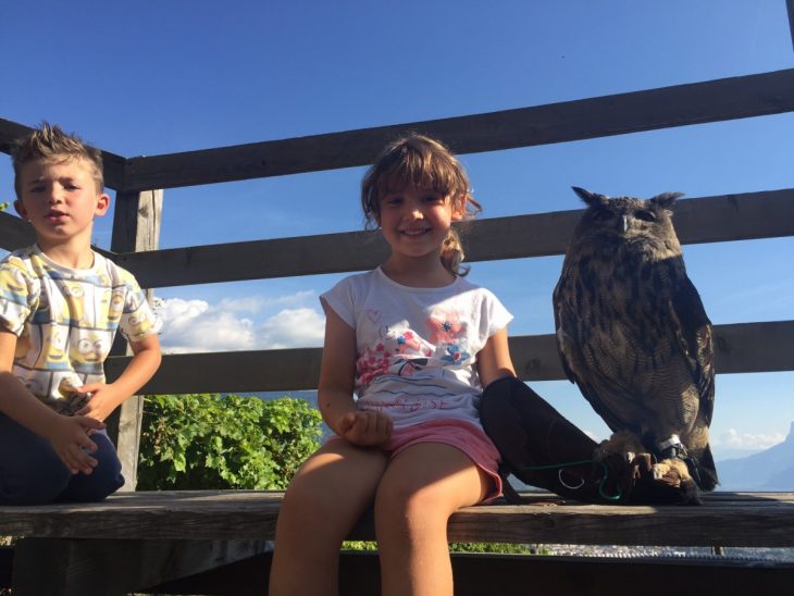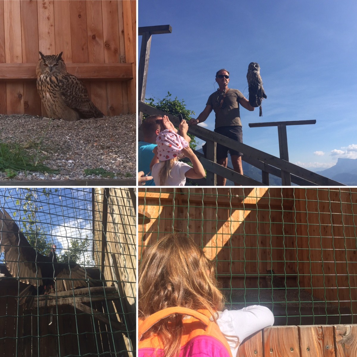 La parte più affascinante della visita è la dimostrazione di volo: giornalmente alle 11.15 e alle 15.15 vengono lasciati volare liberi sulla collina di Castel Tirolo diversi uccelli. Durante la dimostrazione, della durata di circa mezz’ora (dipende anche dalle condizioni atmosferiche), i visitatori hanno la possibilità di vedere aquile, avvoltoi, falchi, gufi e poiane in azione e di conoscerli da vicino. Davvero da vicino, visto che passano proprio sopra le teste degli spettatori. Divertenti i commenti di Willi, uno dei due titolari, sulle abitudini e le caratteristiche degli uccelli in volo. Alla fine dello show i bambini possono posare con un bellissimo gufo (attenzione che vi verranno chiesti 10 euro per avere la foto ricordo, secondo me se siete preparati – altrimenti sembra quasi che non permettano al bambino di indossare il guanto apposito e far salire sul braccio il gufo – potete evitare e farla con il vostro telefono!)