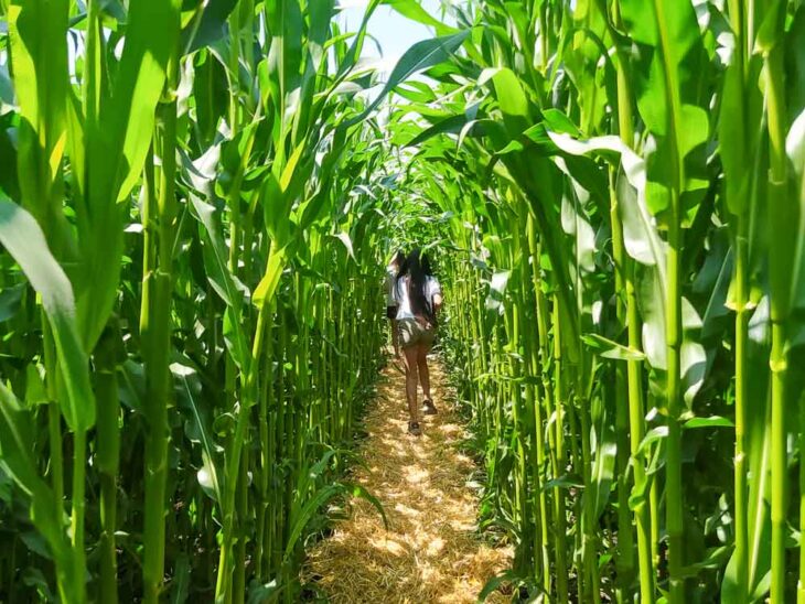 E poi che bello camminare e correre in mezzo a queste foglie verdissime che fanno contrasto con la paglia usata per creare i sentieri e l’azzurro del cielo! Per completare il labirinto mettete in conto un’oretta, sempre che non pensiate di perdervi….