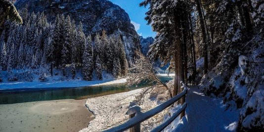 Il lago di Braies, piccolo lago alpino situato a 1500 m di altitudine nel Parco Nazionale Fanes-Senes-Braies, non si spiega a parole, non ne esistono per descriverlo, né in inverno né in estate. E’ una delle mete imperdibili almeno una volta nella vita. In inverno si veste di magia: coperto da neve e ghiaccio e circondato dai boschi e dalle pareti delle montagne, risplende sotto i raggi del sole nelle belle giornate e incanta in quelle grigie…
