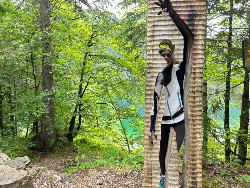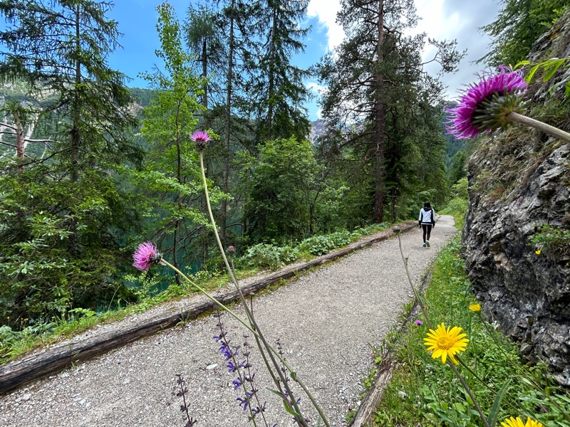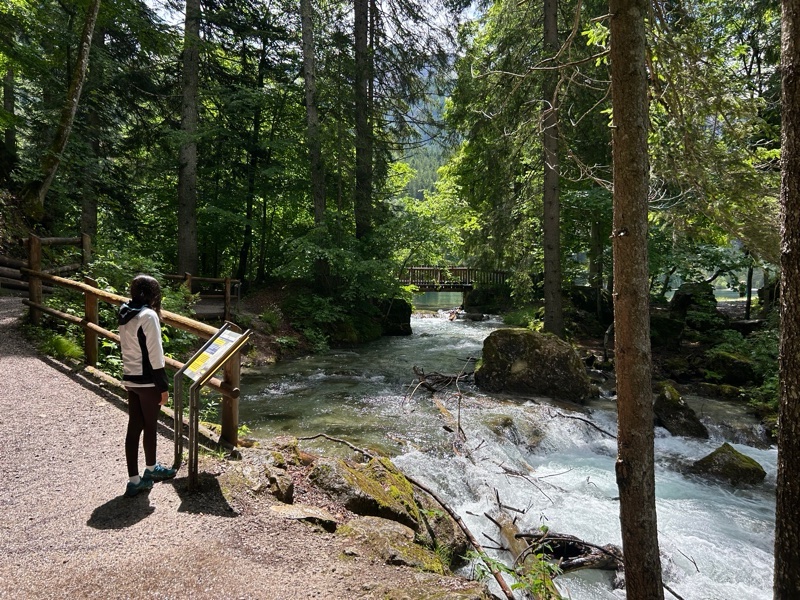 Raggiunti i parcheggi più vicini, dove sono presenti anche comodi bagni pubblici sempre aperti, mancherà davvero poco per raggiungere il lago. Si segue per una decina di minuti il sentiero pianeggiante nel bosco che costeggia il rio. Lungo il percorso si trovano anche dei cubi didattici con informazioni sulla fauna locale. Siete ormai quasi arrivati!