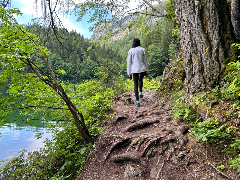 Durante la prima parte del percorso è facile notare, sull’altra sponda del lago, alcune spiagge bianche. Continuiamo quindi il nostro giro per avvicinarci! A proposito: non è vietato fare il bagno qui, ma sappiate che l’acqua è molto molto fredda!