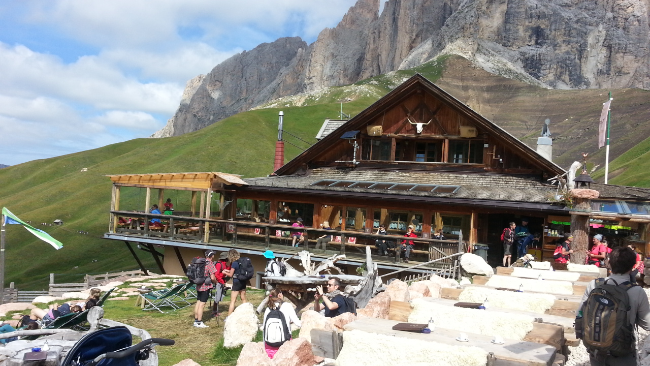 Si può arrivare al rifugio Fredrich August anche da Passo Sella in una mezz’ora, senza prendere gli impianti.