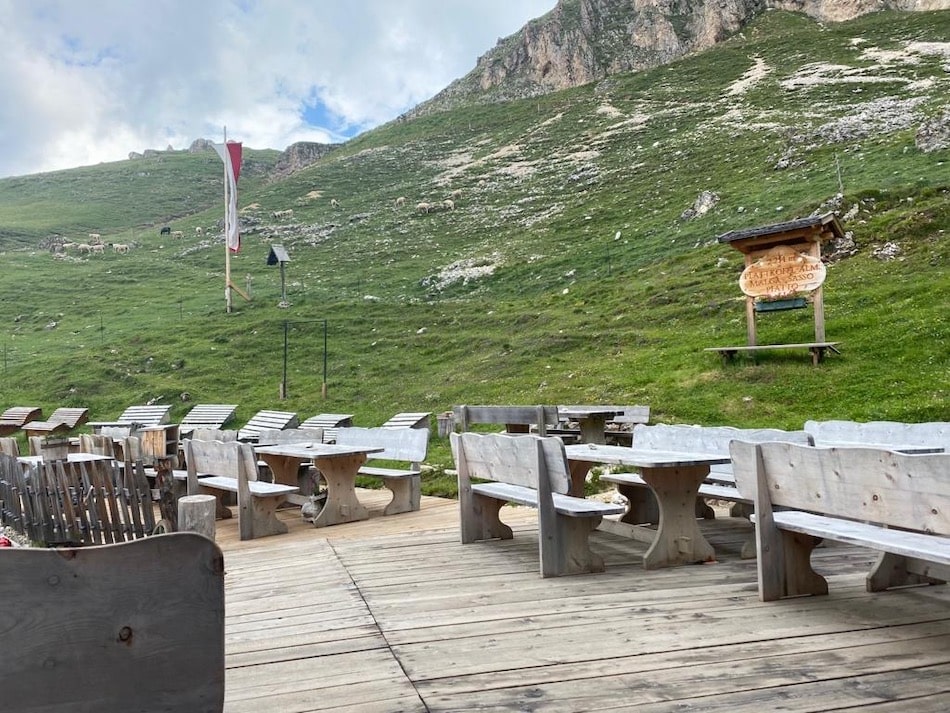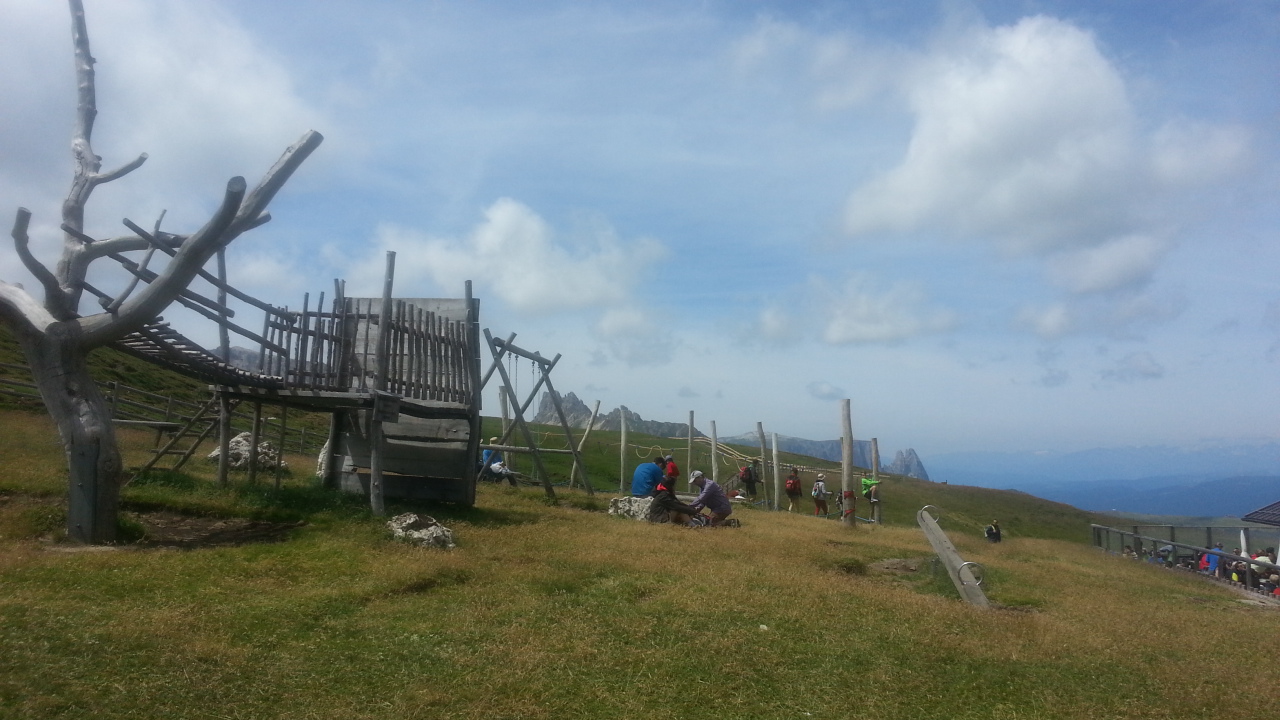Altrimenti proseguite, come abbiamo fatto noi in entrambi i casi. In 45 minuti circa, su un sentiero comodo che costeggia appunto il Sassopiatto, siamo arrivati al rifugio Pertini: anche questo in una bella posizione e con una carrucola e qualche gioco che può costituire una bella pausa per i più piccoli. In altri 45 minuti siamo arrivati al rifugio Sassopiatto: qui siamo già in Alto Adige e come negli altri posti l’impronta tedesca si nota subito. Sullo sfondo l’Alpe di Siusi e l’Alpe di Tires, accanto al rifugio un bellissimo parco giochi con altalene, percorso in legno, sabbiera, corda per l’equilibrio e altri giochi carini.
