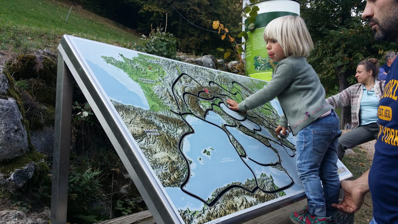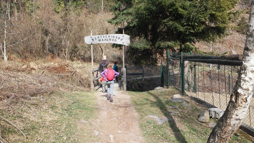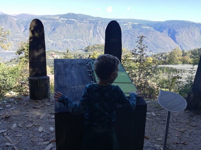 La prima parte attraversa il bosco, poi invece ecco spuntare come per magia lunghe distese di prati con mucche al pascolo. E dalla parte opposta della valle si intravedono le inconfondibili Odle, che possono essere ammirate anche ai binocoli in legno appesi agli alberi.