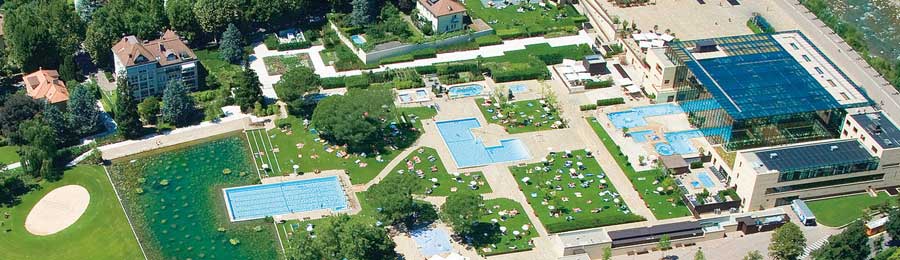 Si possono sperimentare: la vasca sportiva (25 °C), la piscina per non nuotatori (28 °C), una per bambini (28 °C), il percorso Kneipp (34 °C – 18 °C), la vasca d’acqua sorgiva (34 °C), contro corrente (34 °C), con acqua fredda e calda (18 °C – 34 °C) e la di raffreddamento (25 °C)