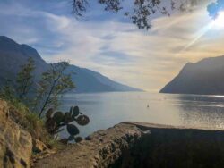 Ci si può perdere a guardare le vele, i battelli, i gabbiani e via via il panorama, prima su Torbole e la conca del Linfano, poi su Riva del Garda, sovrastata dall’Adamello e il Carè Alto.
