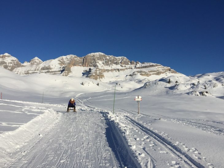 Ci troviamo a Madonna di Campiglio dove, comodamente dal centro si prende la telecabina Spinale (tariffe sempre aggiornate QUI). In pochi minuti si arriva a poco più di 2000 metri di altitudine. Da qui si imbocca la pista da slittino. Bello il panorama e divertenti le discese, con pendenze, curve e ogni tanto anche dei pianori che permettono di rallentare un pochino.