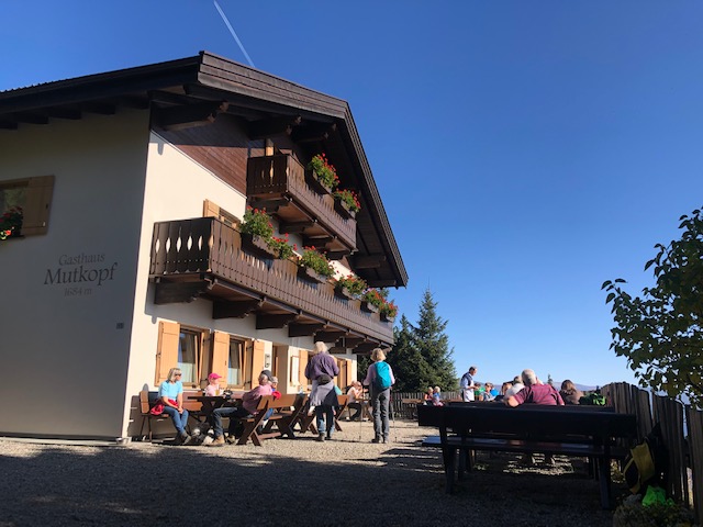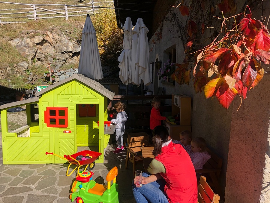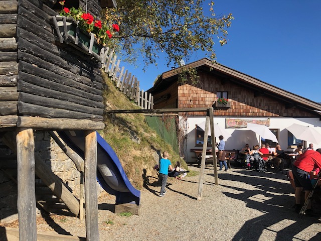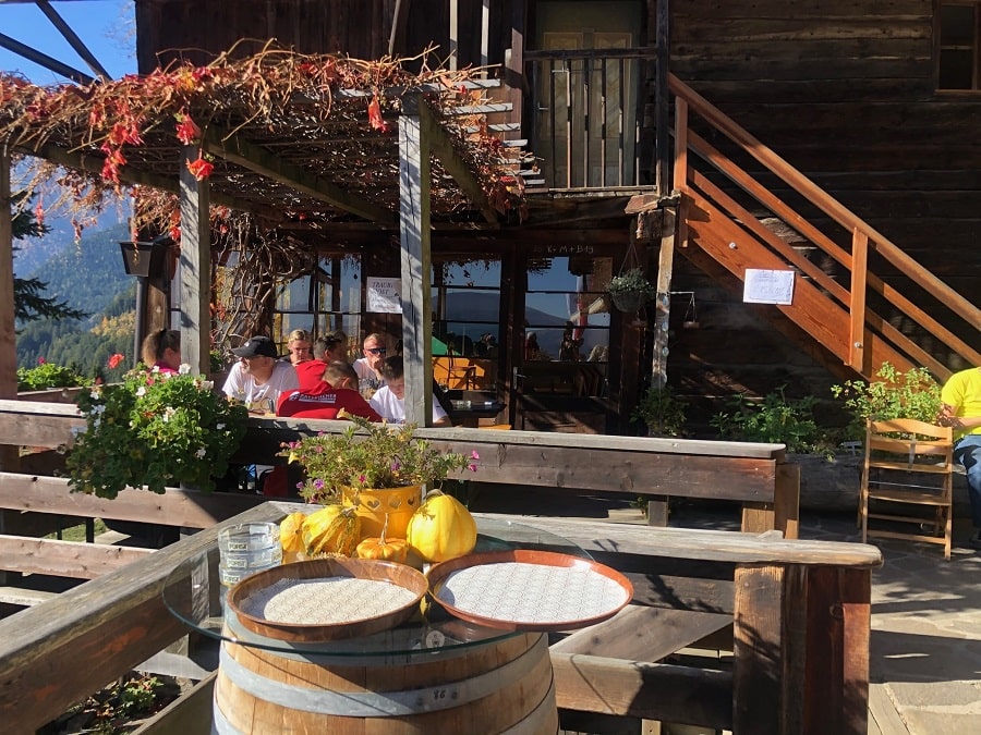 Ultima fatica con una salitina di dieci minuti ed ecco il ristorante (nella foto principale e foto sotto), con una bella terrazza soleggiata, ottimi piatti della tradizione tirolese, un bel prato sotto con un piccolo zoo e alcuni giochi…